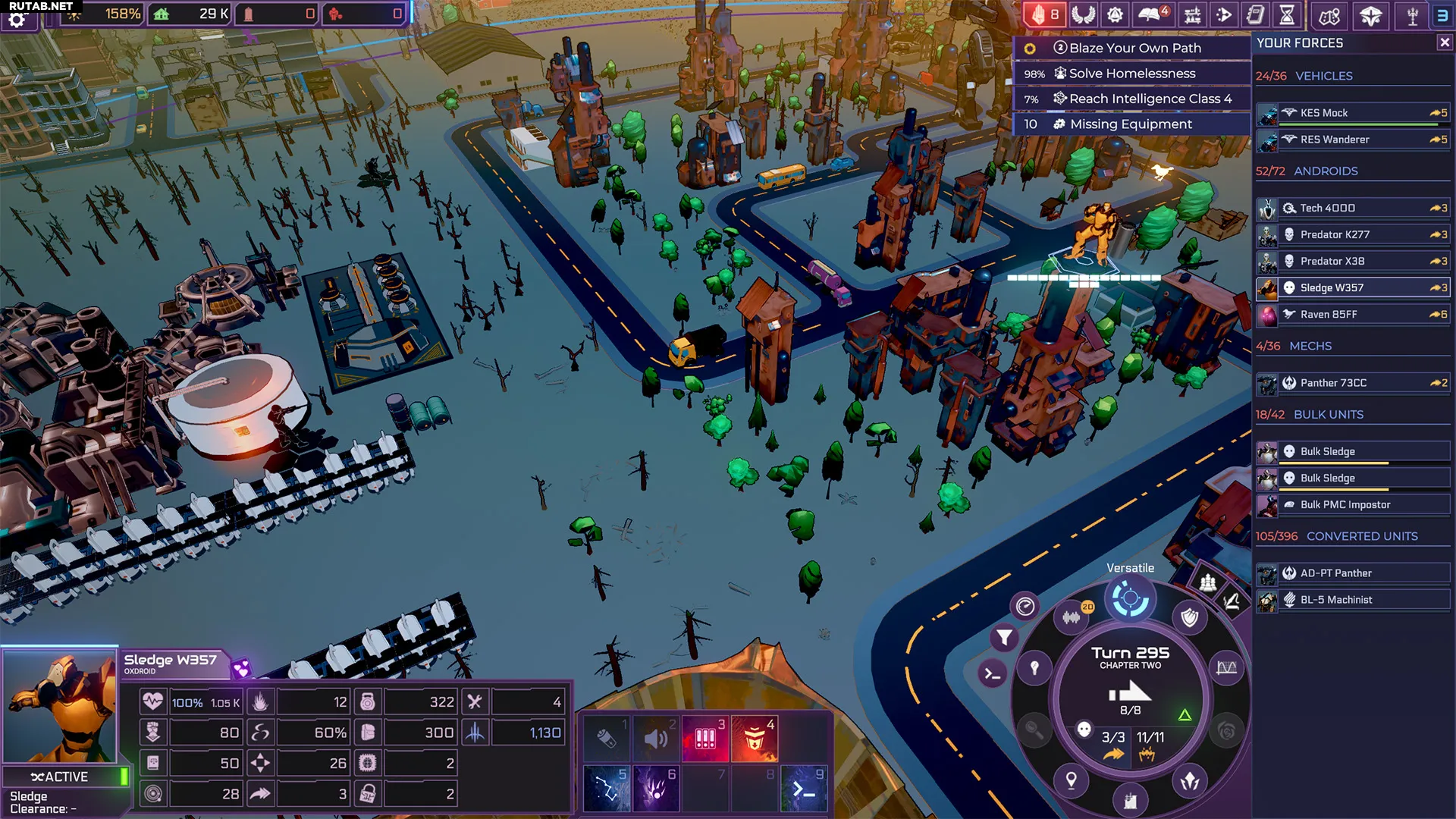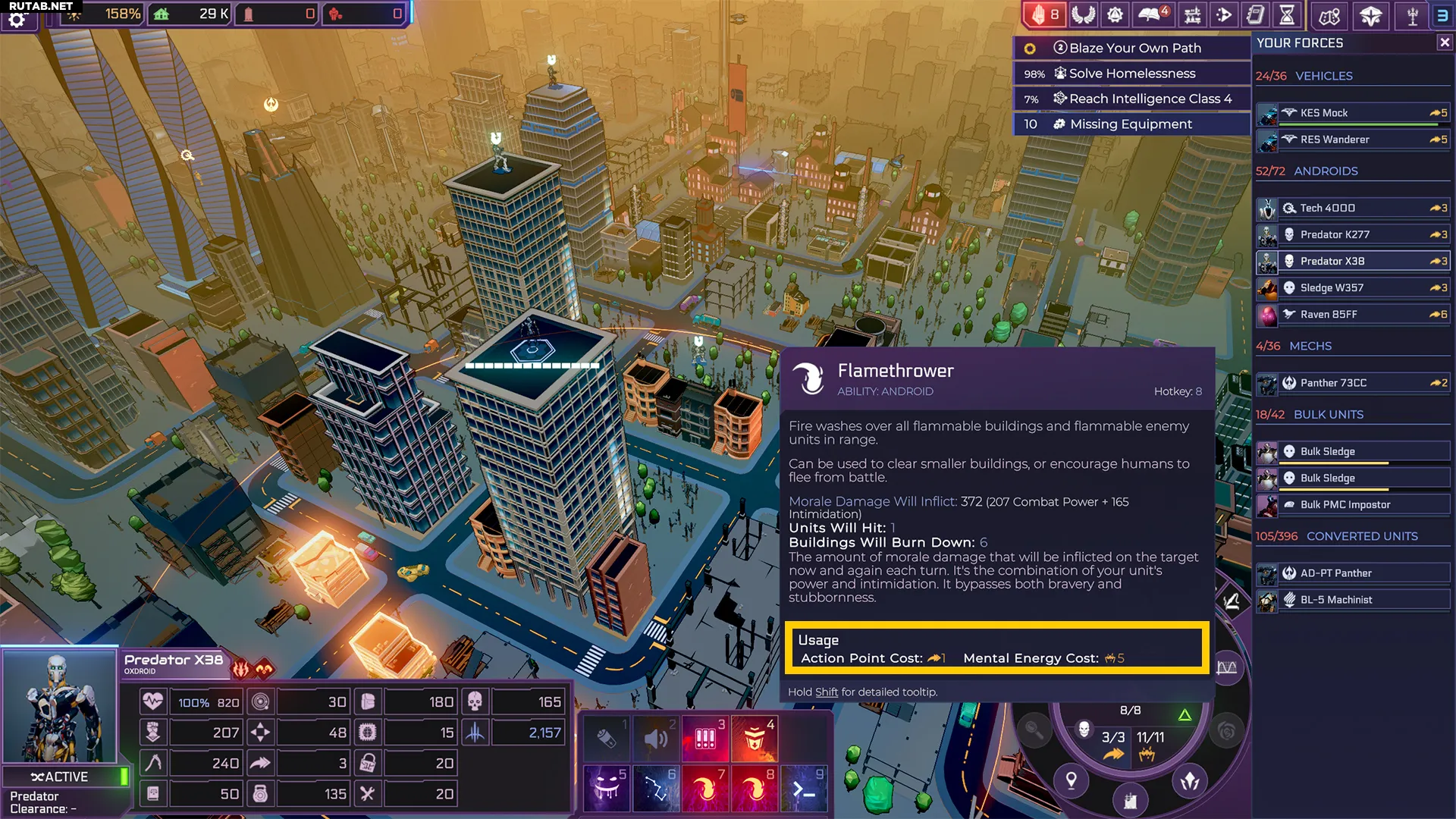 Твои юниты также обладают способностями, которые можно использовать в зависимости от характеристик андроида. Это позволяет реагировать на конкретные ситуации разными юнитами, готовясь к любому сценарию. Большинство способностей доступны для любого типа юнитов, например, «Укрытие» для снижения урона или «Деморализация» для атаки, снижающей боевой дух без причинения физического вреда.