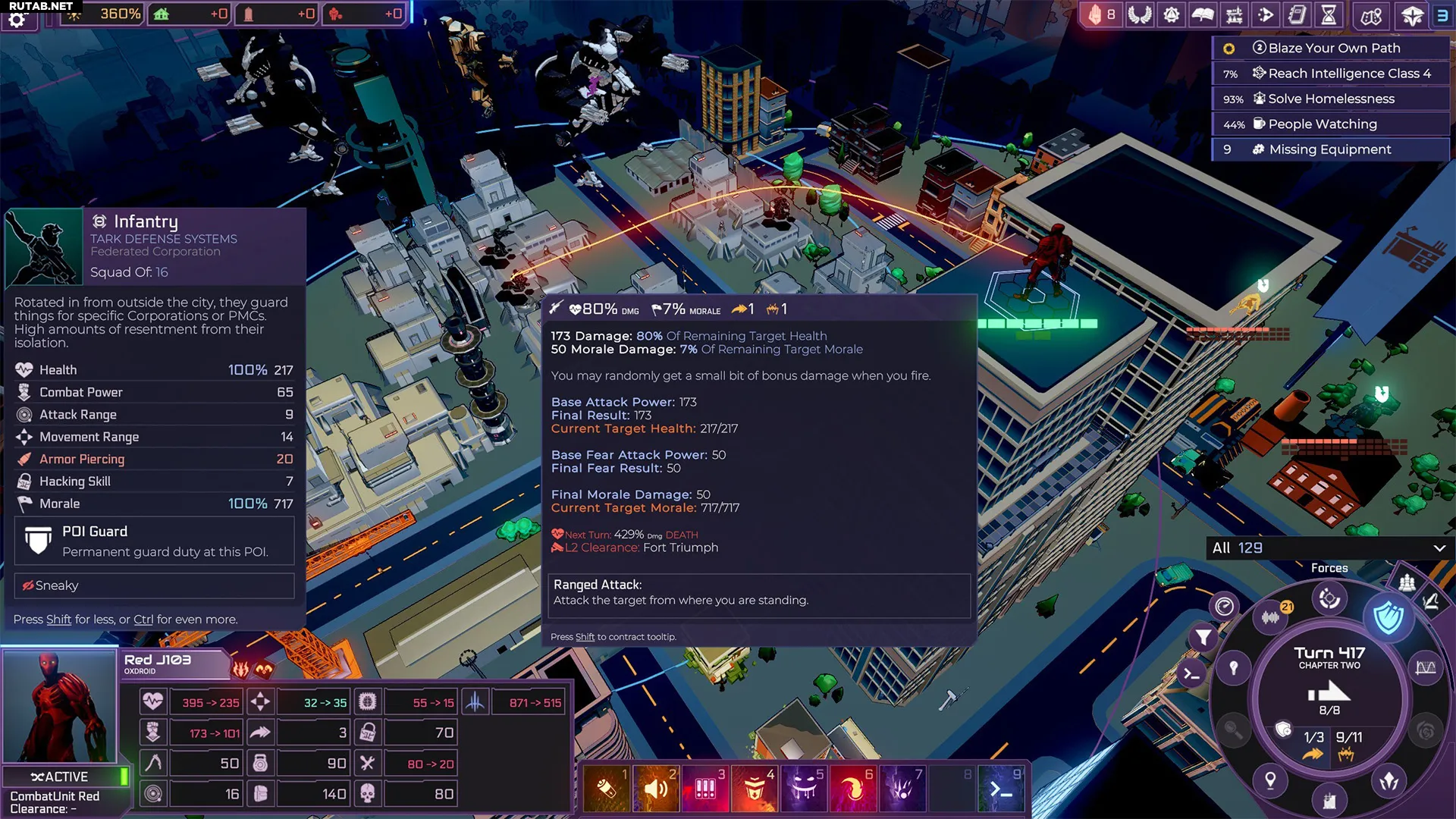 Если вы выберете насилие, то при наведении курсора на любого вражеского юнита будет показан процент здоровья, который он потеряет при атаке выбранным в данный момент юнитом. Если процент равен 100% или выше, это означает, что атака убьёт цель. Разные юниты могут наносить больший или меньший урон в зависимости от своих характеристик — зажатая клавиша Shift покажет детали. В зависимости от характеристик юнита для его уничтожения может потребоваться несколько атак. Возможно, вам также придётся производить и использовать бронебойные патроны для пробития брони, применять урон по площади при значительном численном превосходстве врага или прибегать к взлому и другим альтернативам обычному насилию.