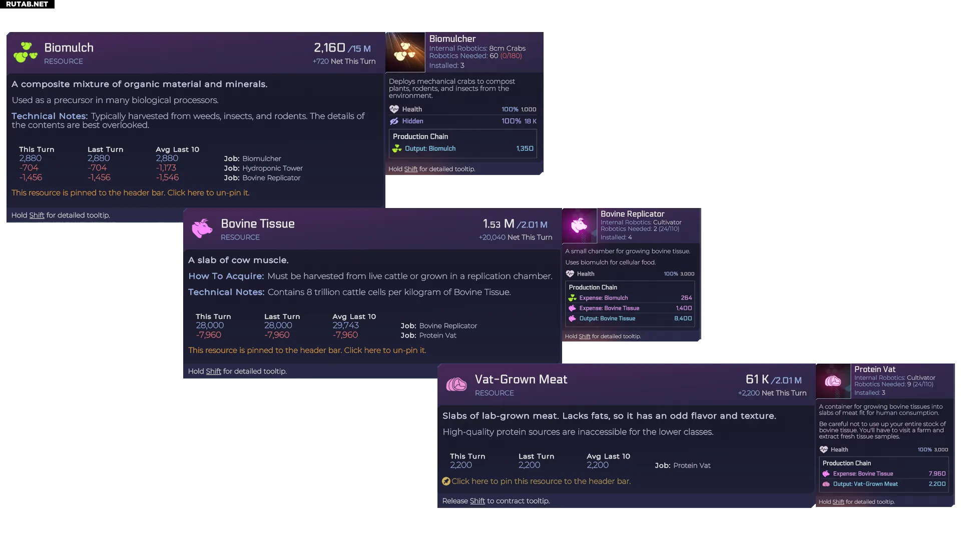 На примере приведённой производственной цепочки видно, что 2200 единиц Мяса из чана производится из 7960 единиц Коровьей ткани, которая, в свою очередь, выращивается (28000 единиц) с использованием 1456 единиц Биомульчи. Биомульча также используется Гидропонной башней, которой для производства Гидропонной зелени и дополнительных Овощных семян требуются Овощные семена, Биомульча и Очищенная вода.