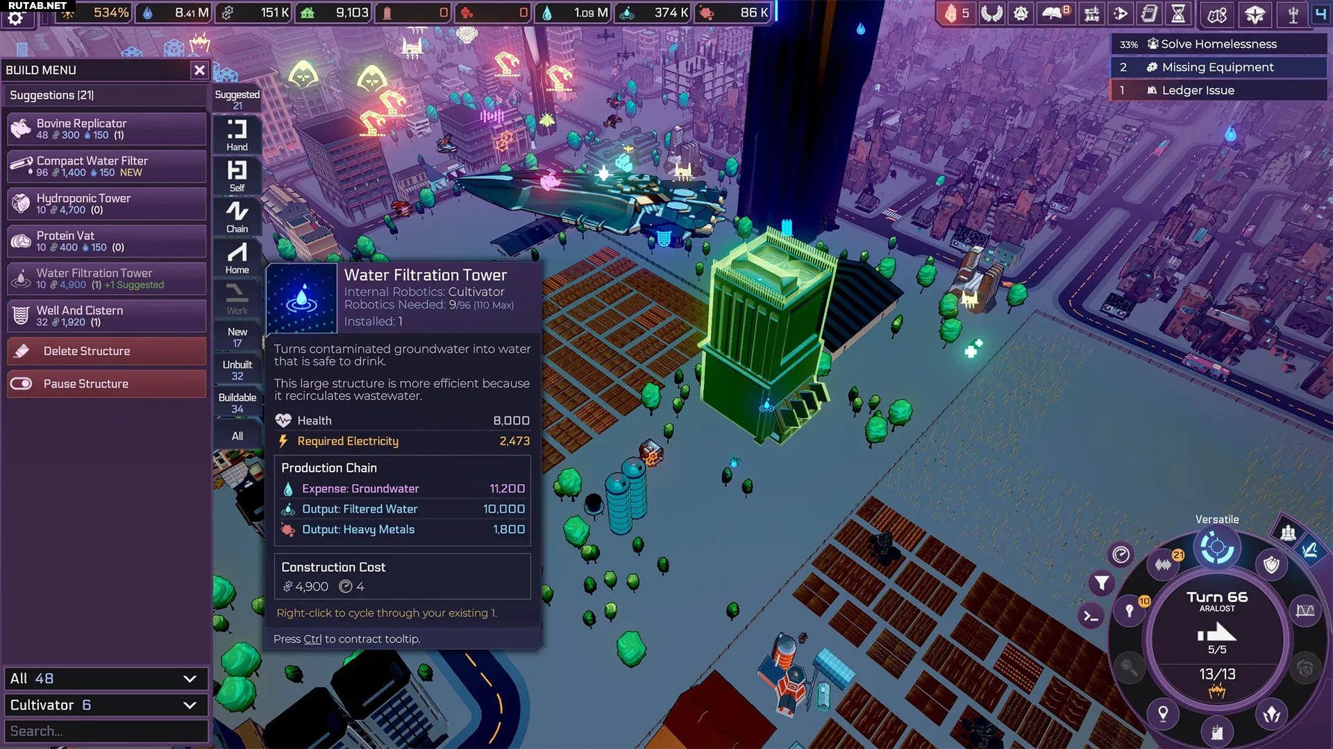 Рассмотрим на примере Водонапорной башни с фильтром. Эта информация разбита на блоки: здание использует Внутреннюю Робототехнику типа «Культиватор» и требует для работы 9 роботов-культиваторов. В данный момент доступно 96 из 110 максимальных роботов этого типа, так как 14 уже задействованы во всех зданиях, использующих эту робототехнику. Наконец, одно такое здание уже построено. Зелёный текст-подсказка в меню строительства также может рекомендовать другие постройки, исходя из ваших потребностей в ресурсах.