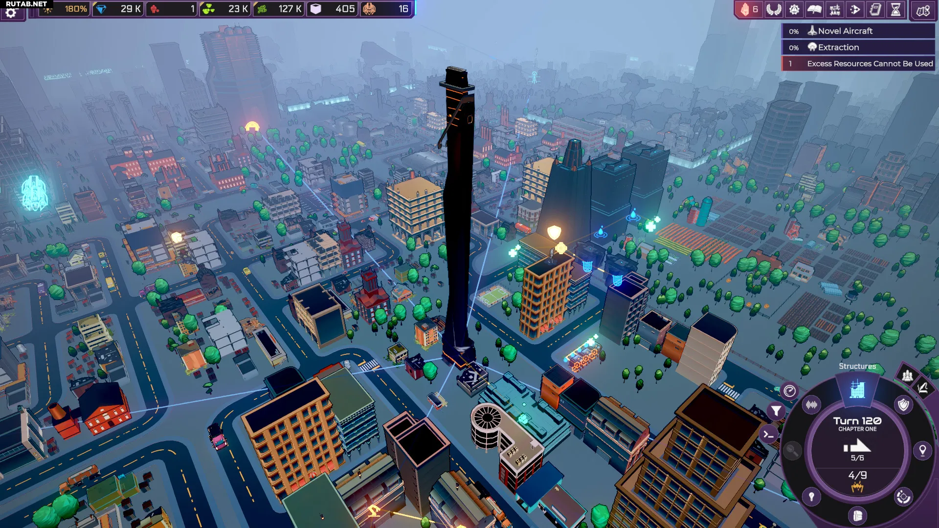 - Сооружения — фокусируется на построенных вами сооружениях, их текущих задачах и радиусах действия.