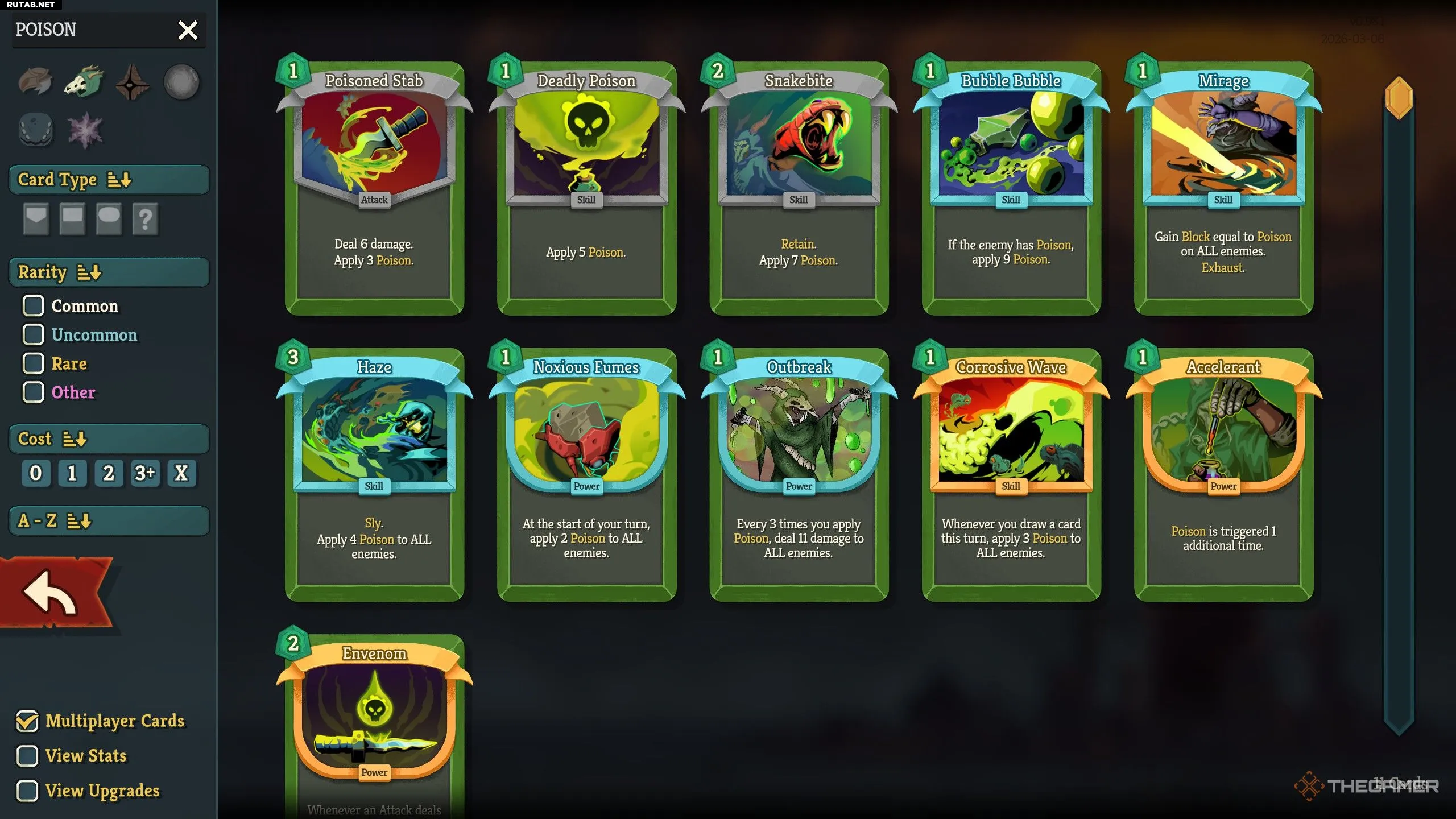 Первая, вероятно, одна из лучших карт для всей этой сборки, так как она срабатывает дважды, что может полностью уничтожить шкалу здоровья врага. «Вспышка» также является отличным добивающим приёмом, так как она может быстро выйти из-под контроля, ведь наложить три стака яда для срабатывания урона в 11 единиц довольно легко. «Мираж» также даёт вам больше выживаемости и позволяет получить много Защиты за один ход.