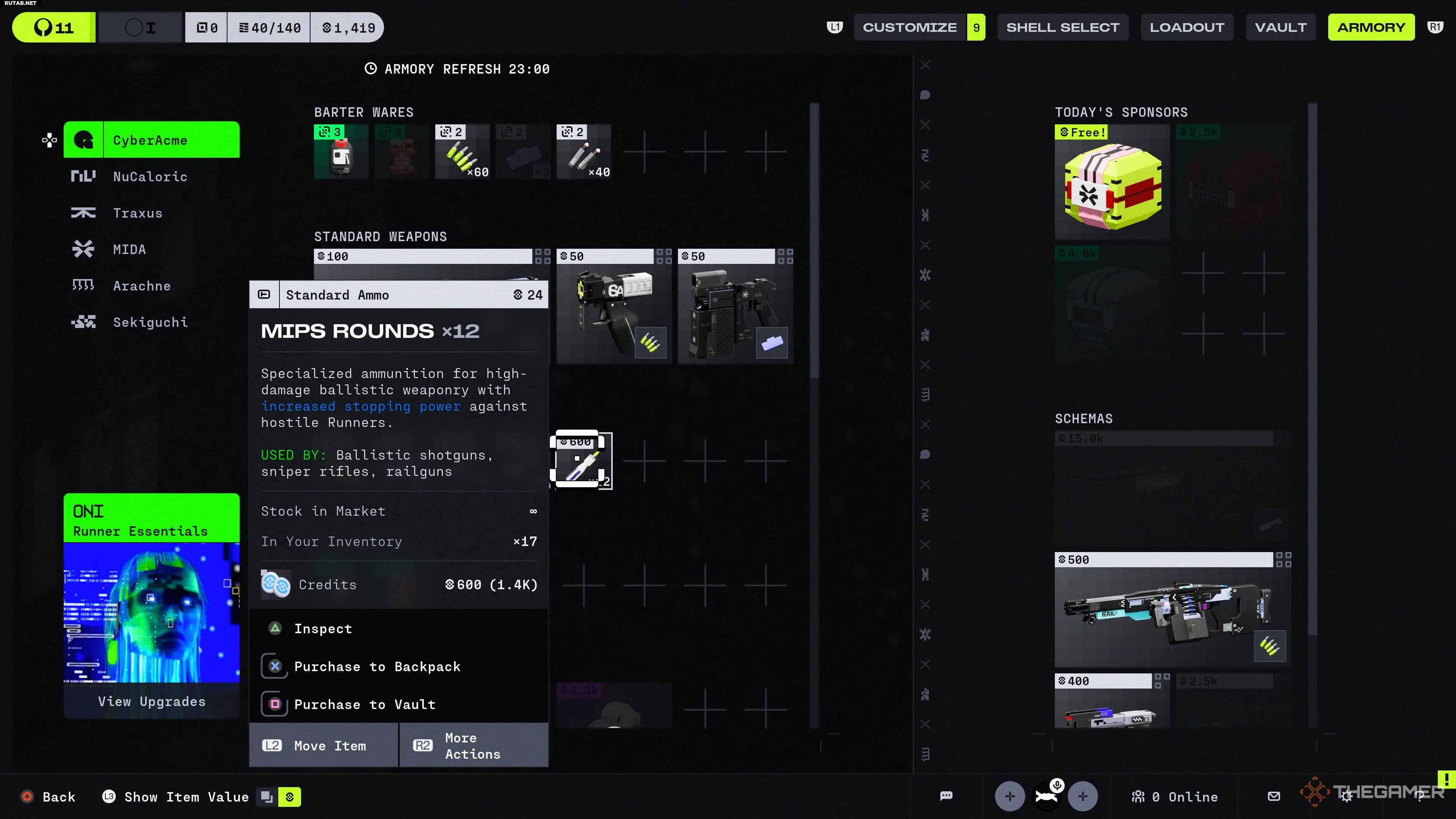Первый вариант проще, так как вам нужны только Кредиты. Перейдите в раздел с боеприпасами у фракции, которая их продает (начальная CyberAcme — одна из них), и купите столько, сколько нужно.