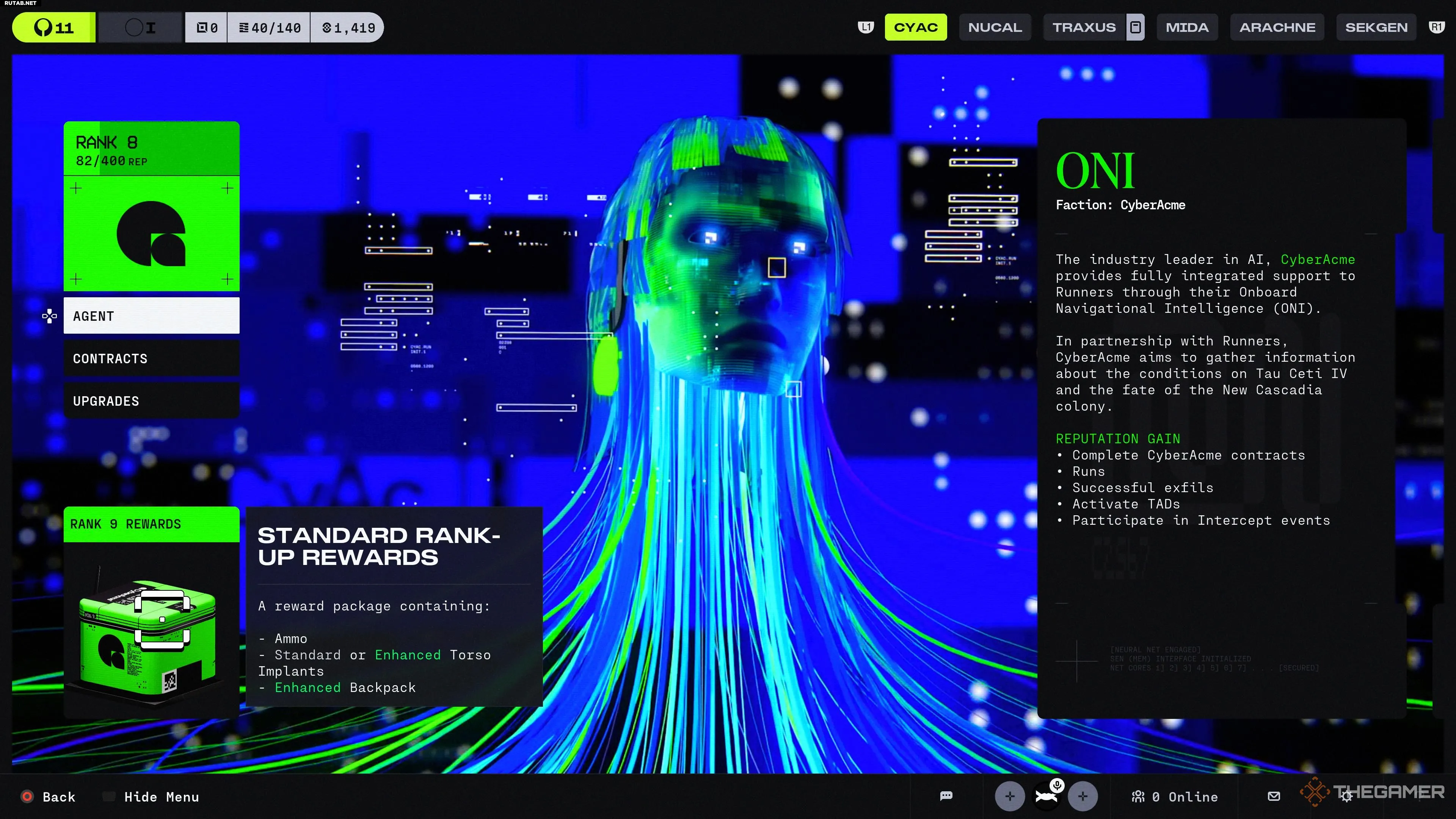 Вы повышаете уровень в CyberAcme, выходя на забеги, выполняя их Контракты, участвуя в Перехватывающих событиях и выбираясь живым.