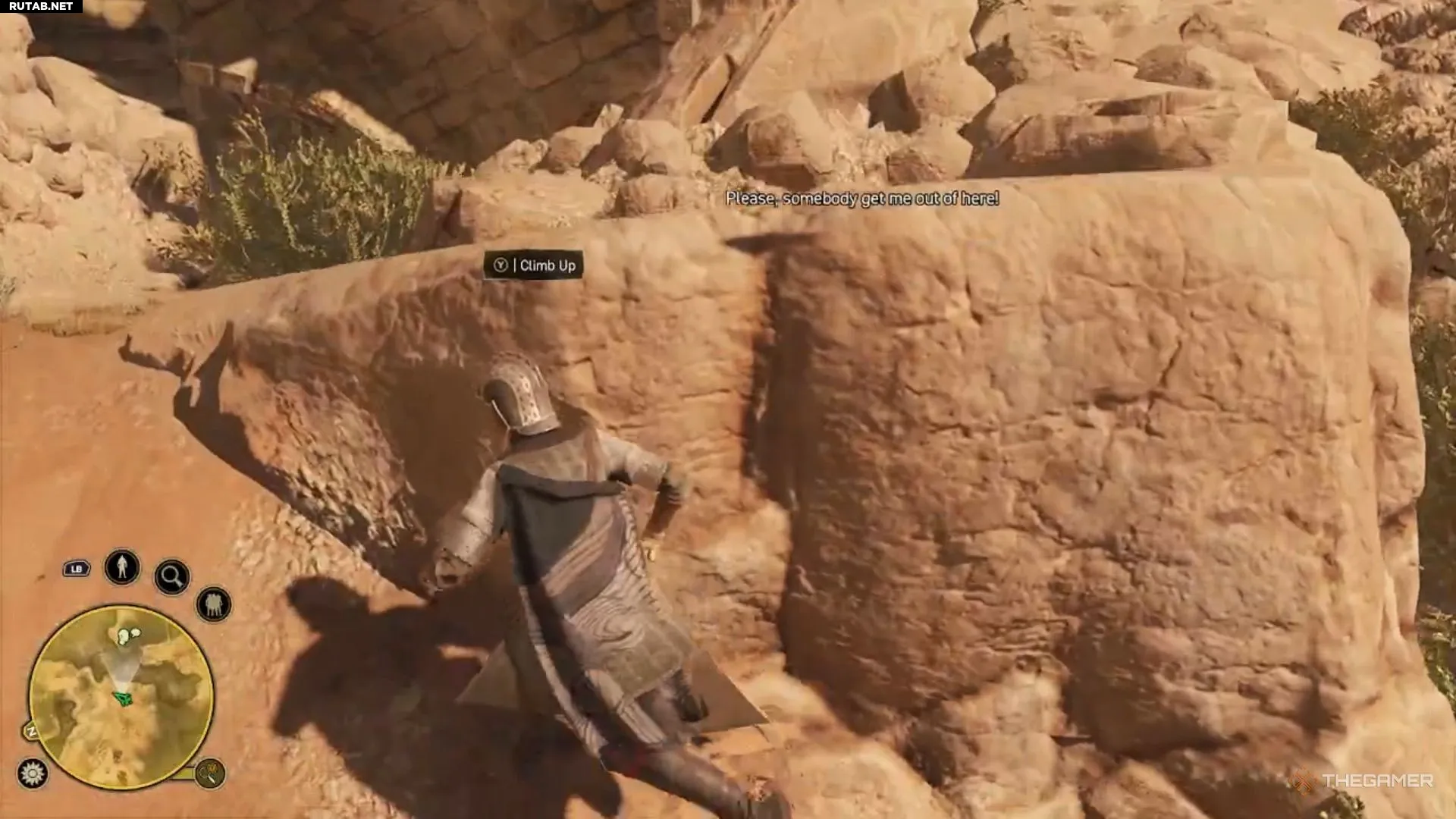 Заберитесь на каменные уступы справа от этой области и пройдите по короткой тропинке налево, чтобы найти источник голоса. Вы встретите Эсера, который по невнимательности свалился и оказался в ловушке под камнями.