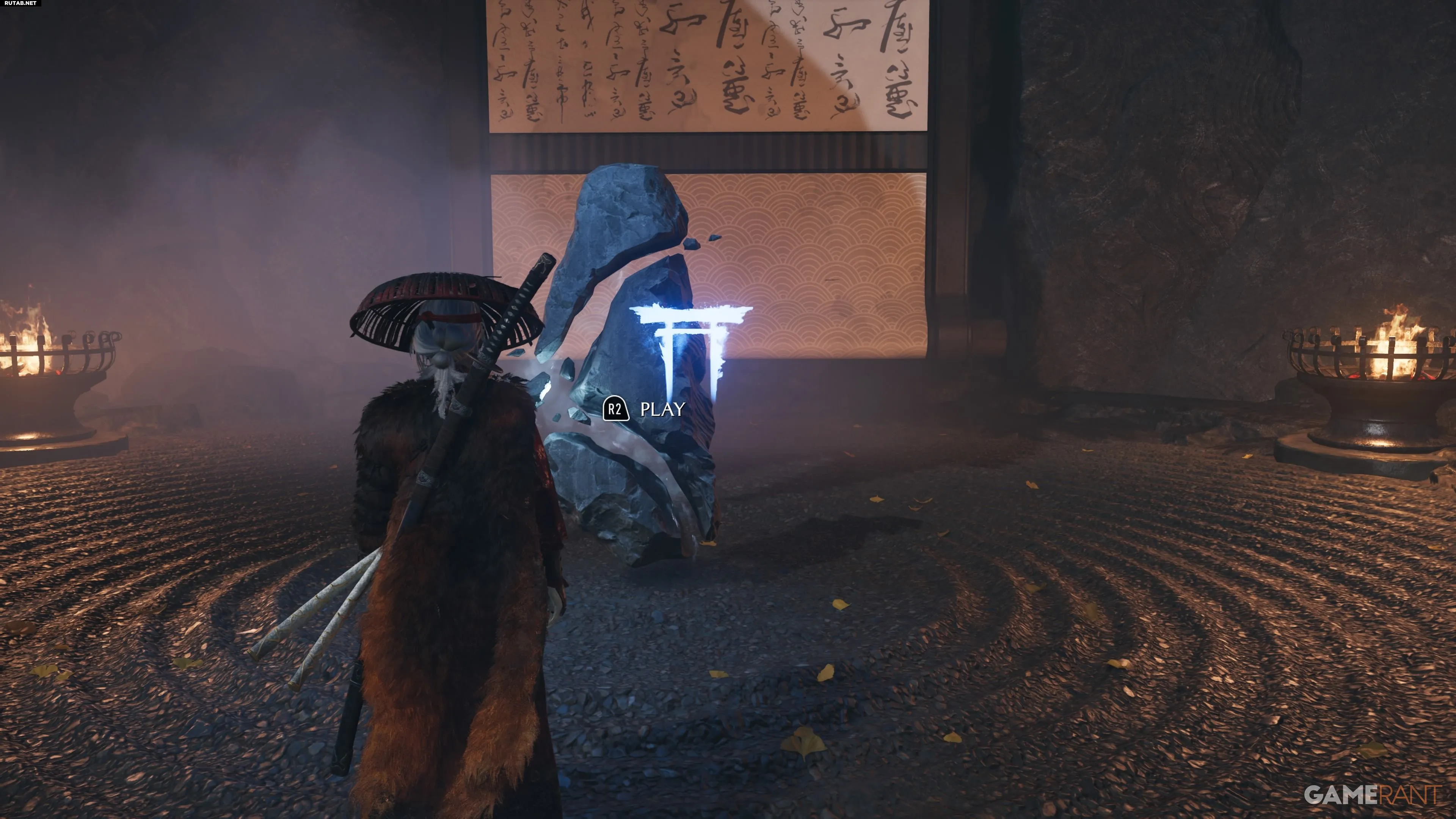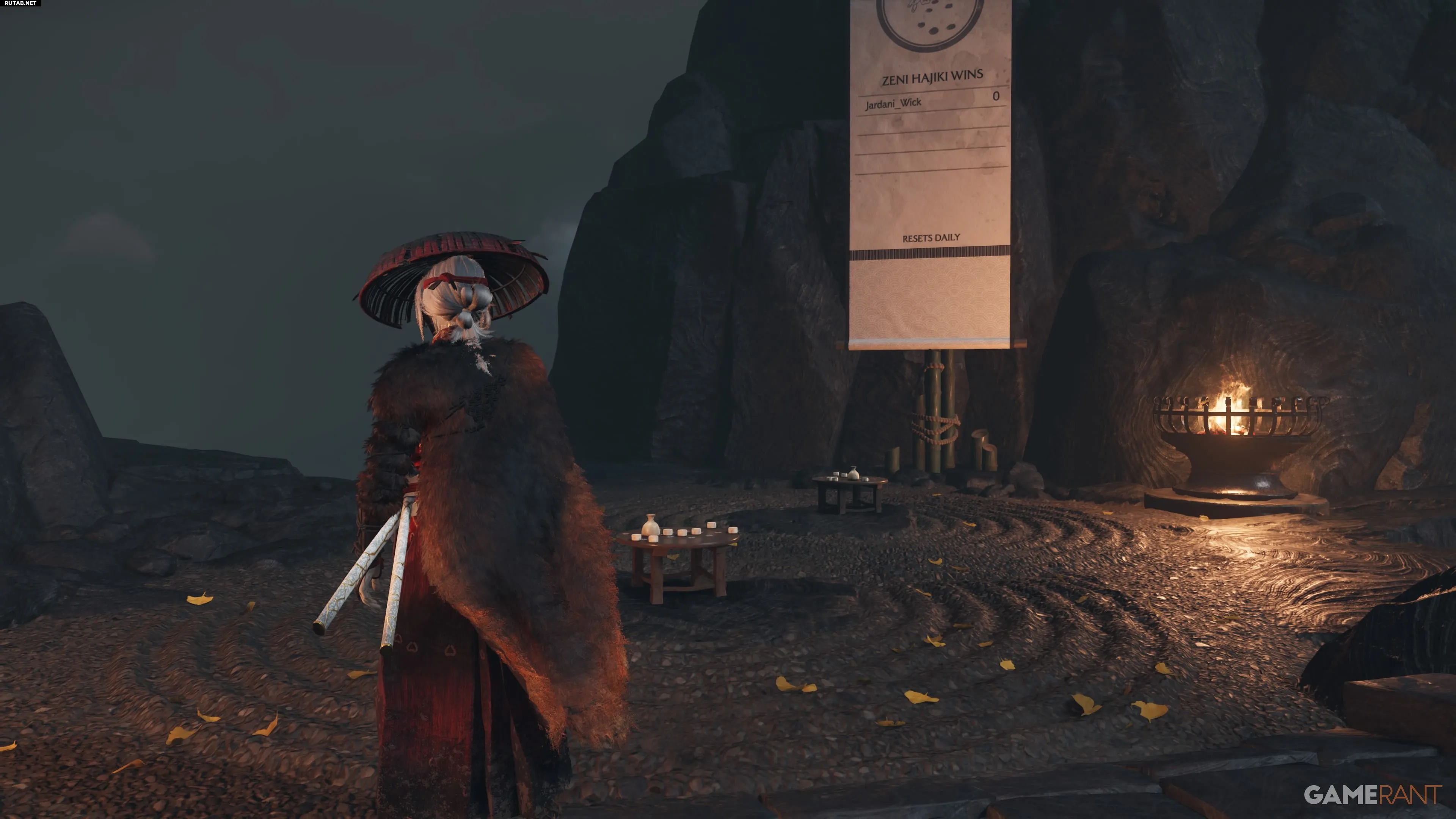 - Подвиги — камень слева от центрального показывает все косметические предметы в Ghost of Yotei Legends и условия их получения.