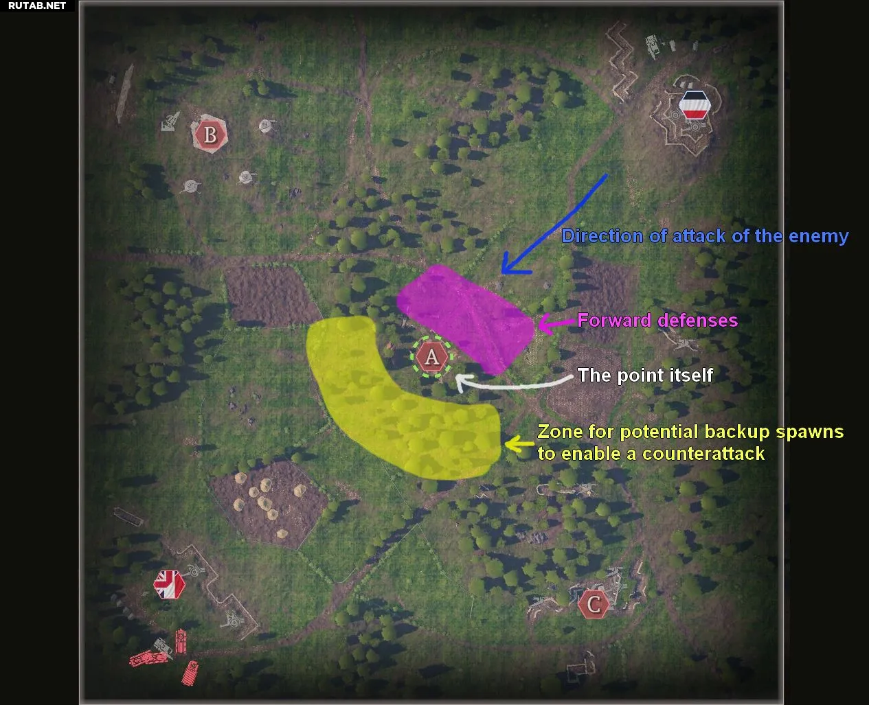 - Красный = вражеский окоп, голубой = союзный окоп, тёмно-синий = огневые позиции / окопы для бокового манёвра.
