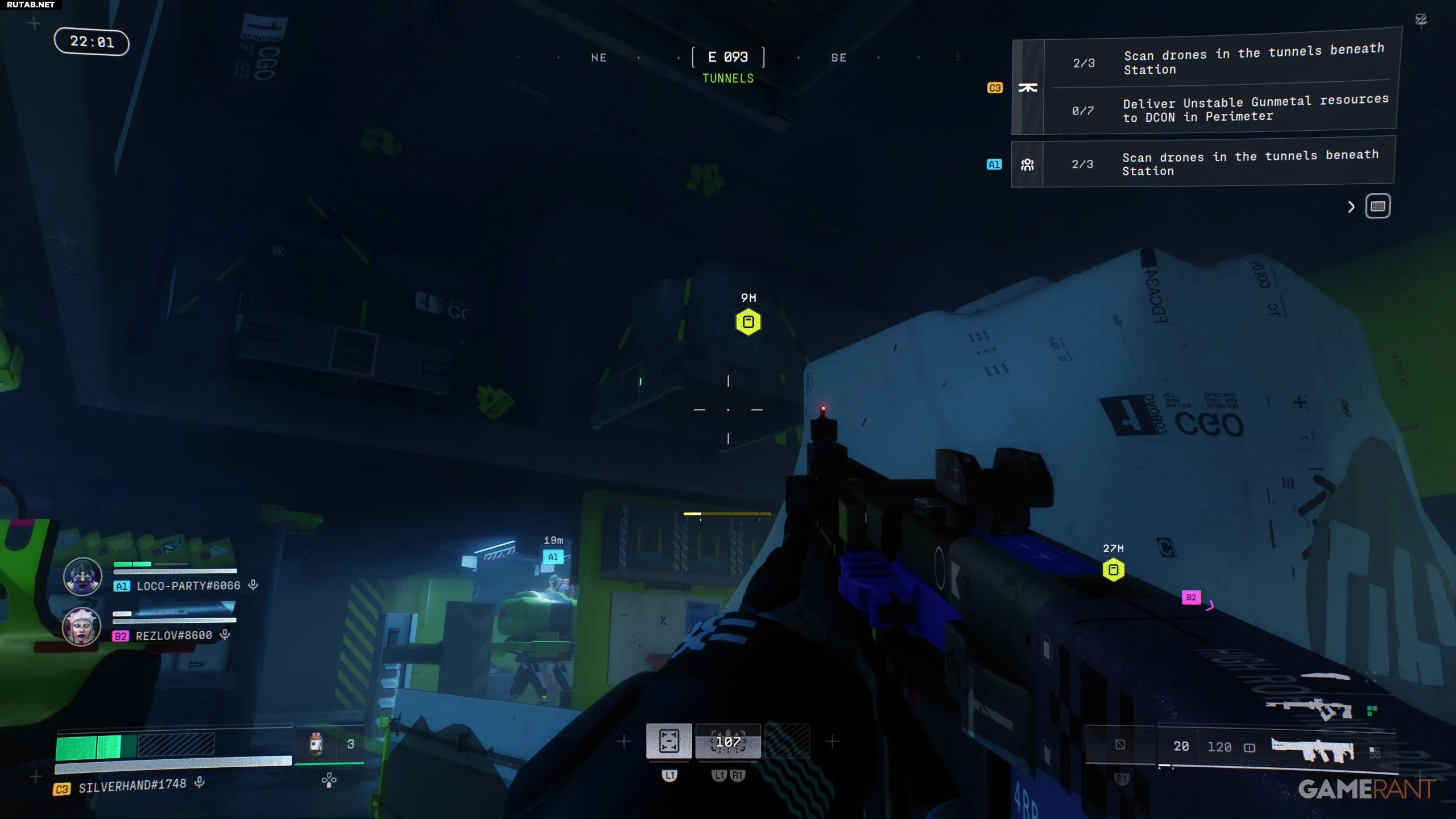 Оба этих шага можно выполнить в точке интереса «Станция» на карте «Периметр». Лучше всего начать с главного здания «Станции» и спуститься по лестнице в гараж, чтобы попасть в туннели. Там вы найдёте много дронов, но взаимодействовать можно только с некоторыми из них.