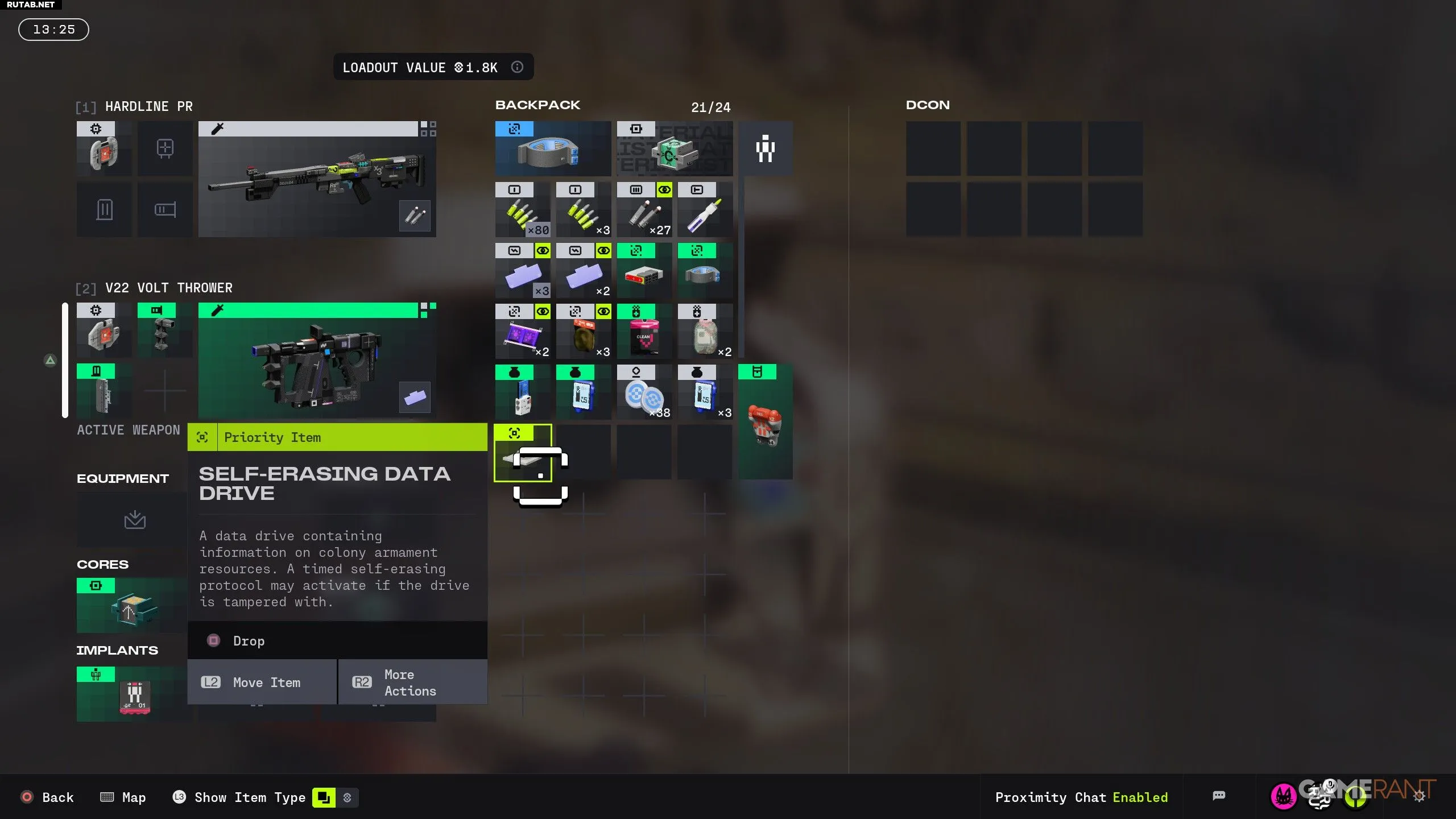 - Взаимодействуйте с терминалом DCON и перетащите самоуничтожающийся накопитель данных из вашего инвентаря в инвентарь терминала.