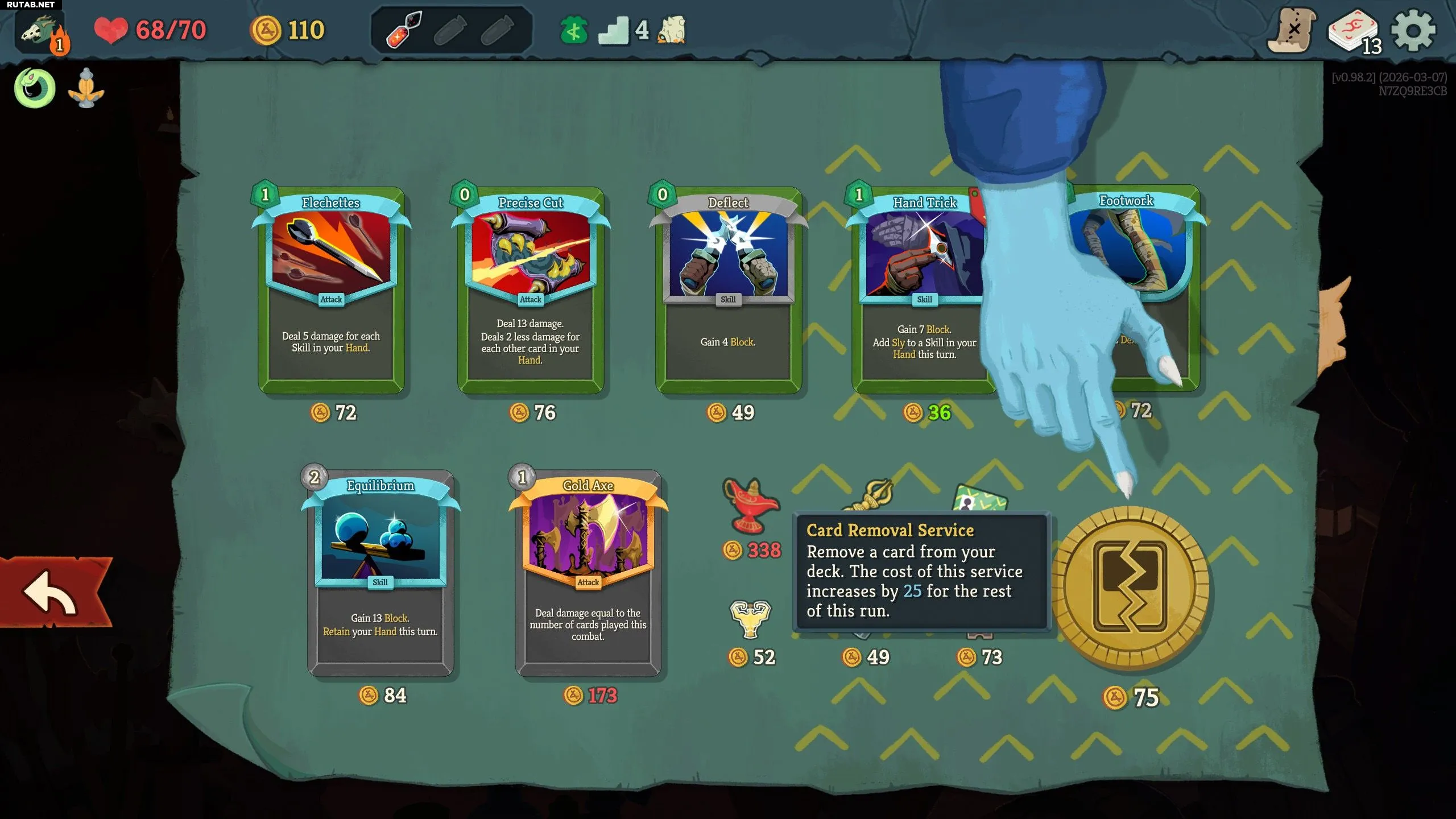 Вы можете заплатить Торговцу, чтобы удалить одну карту из своей колоды при каждом посещении. Некоторые Неизвестные комнаты-события также предложат вам выбор удалить карту из колоды.
