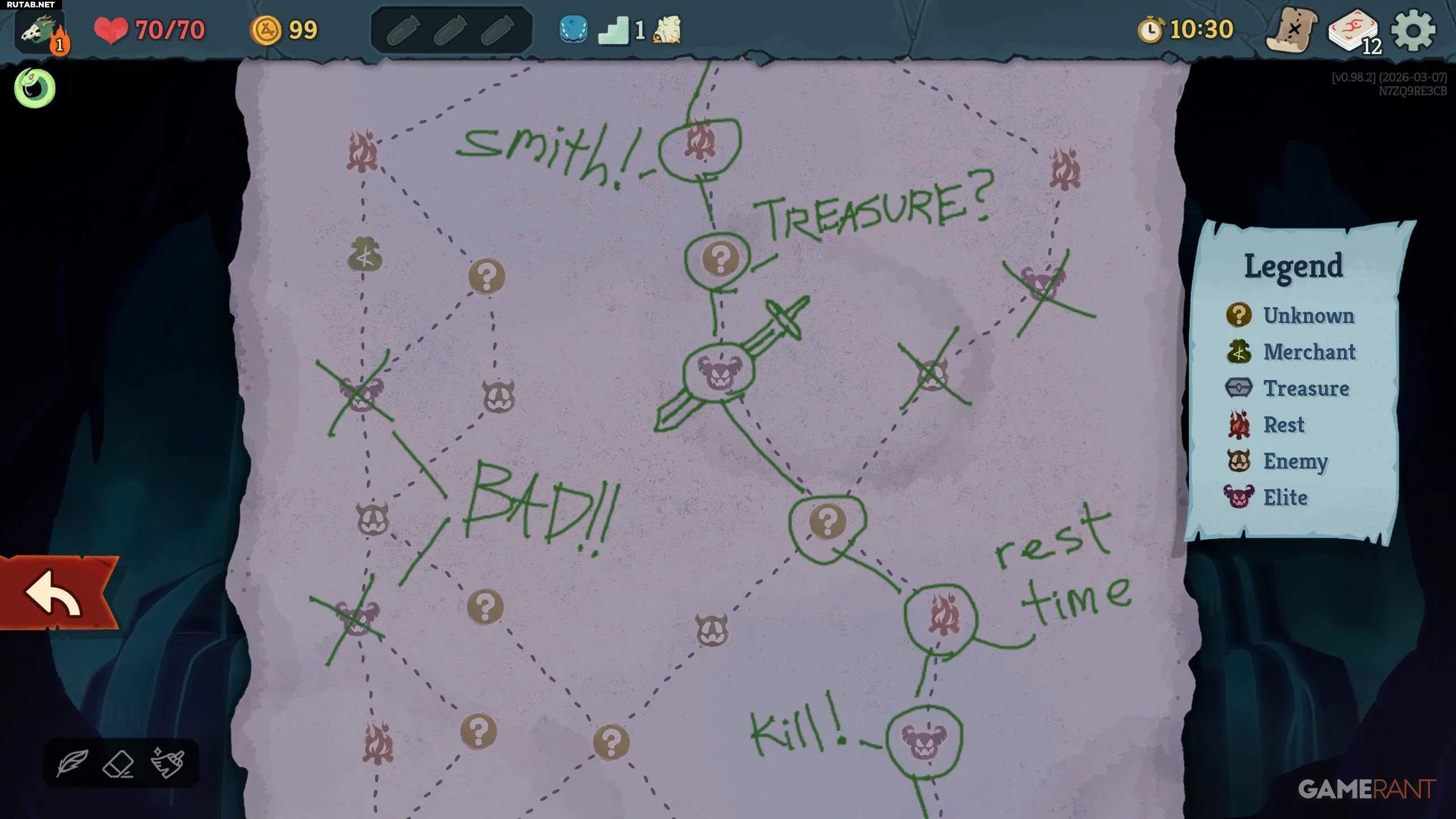 Прежде чем начать забег (и выбрать награду от Нео), вам стоит взглянуть на карту и спланировать оптимальный маршрут. Например, если Нео предлагает сотни золота в начале, может быть полезно выбрать путь с ранним Торговцем. Или, если вы выбрали опцию, снижающую ваше максимальное здоровье, разумно будет проложить маршрут с меньшим количеством встреч с Элитами.