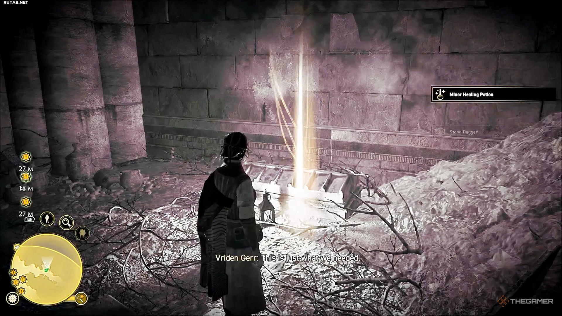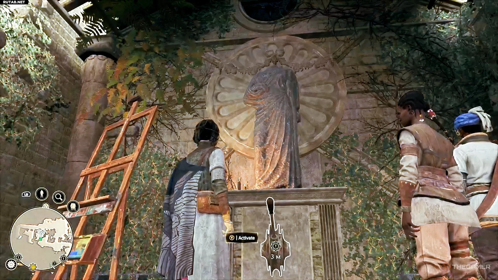 Вам дают записи о каждой статуе. Вы можете прочитать их сразу или сохранить до прибытия в гробницу. Пройдите налево, за группой, и спуститесь глубже в руины.