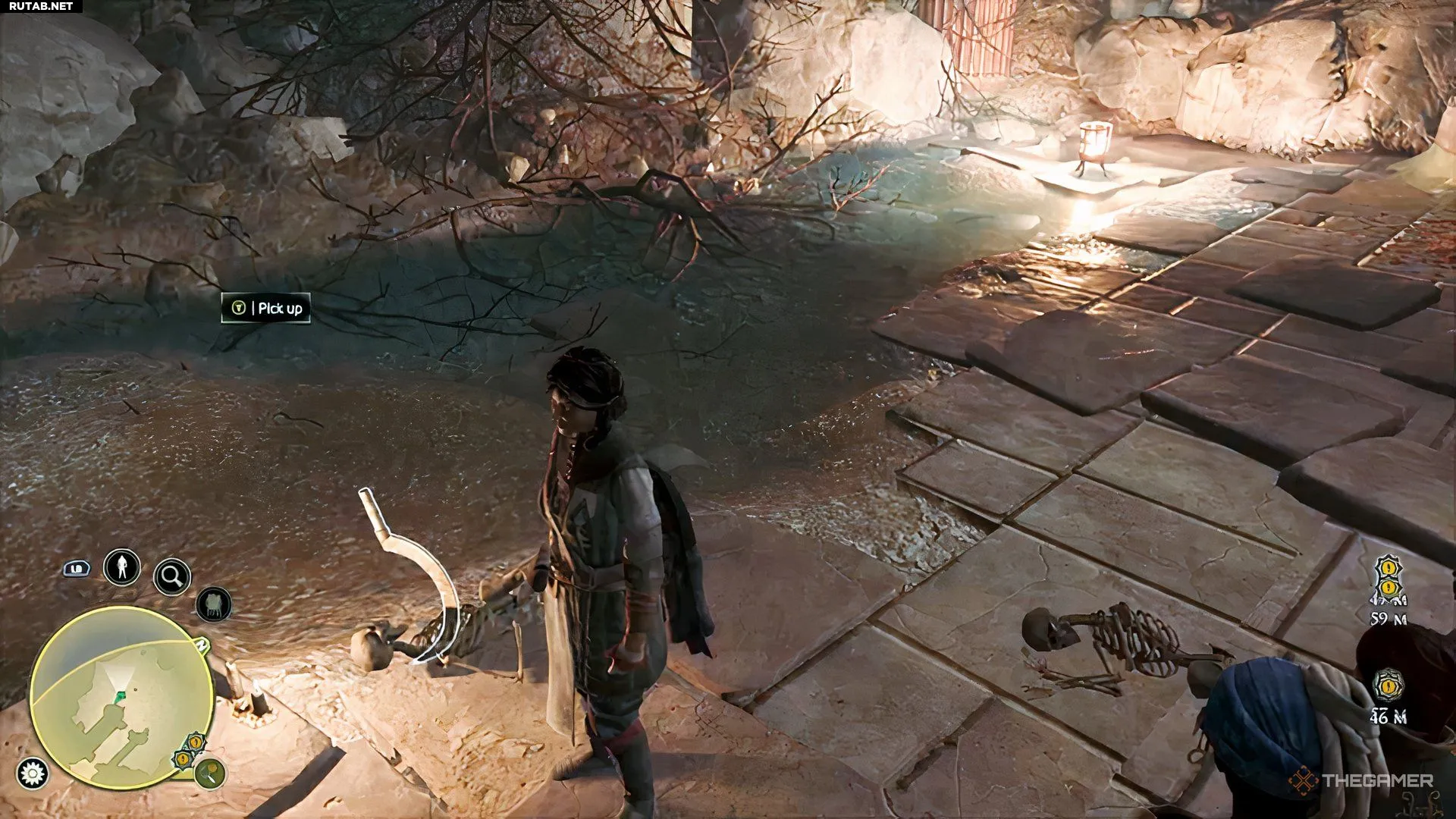 Теперь можно войти внутрь и следовать за маркером задания к следующему рычагу. Будьте осторожны, отбиваясь от ониский, и по пути собирайте все полезные ресурсы. После боя поднимитесь по лестнице, наверху вы найдёте верстак. Заглянув за угол у входа в гробницу, вы увидите, что он заперт.