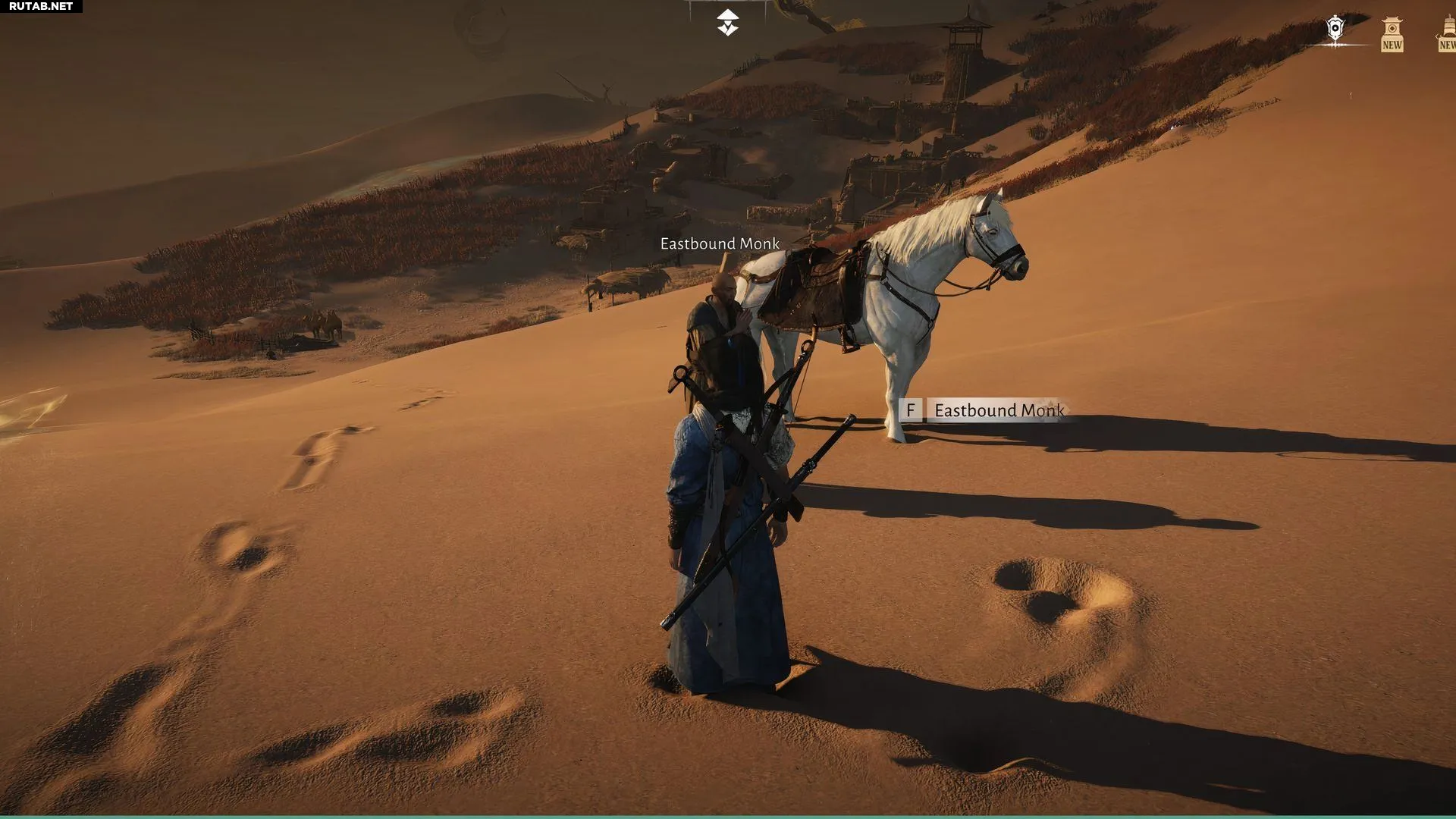 Квест «Последний паломник» активируется в регионе Хэси, а именно у Нефритовых врат, рядом с пограничным камнем Верблюжьей станции. Если отправиться на север от этой точки быстрого перемещения, в пустыне можно увидеть монаха, направляющегося на восток, который стоит рядом с белой лошадью. Поговорите с ним, чтобы начать задание.