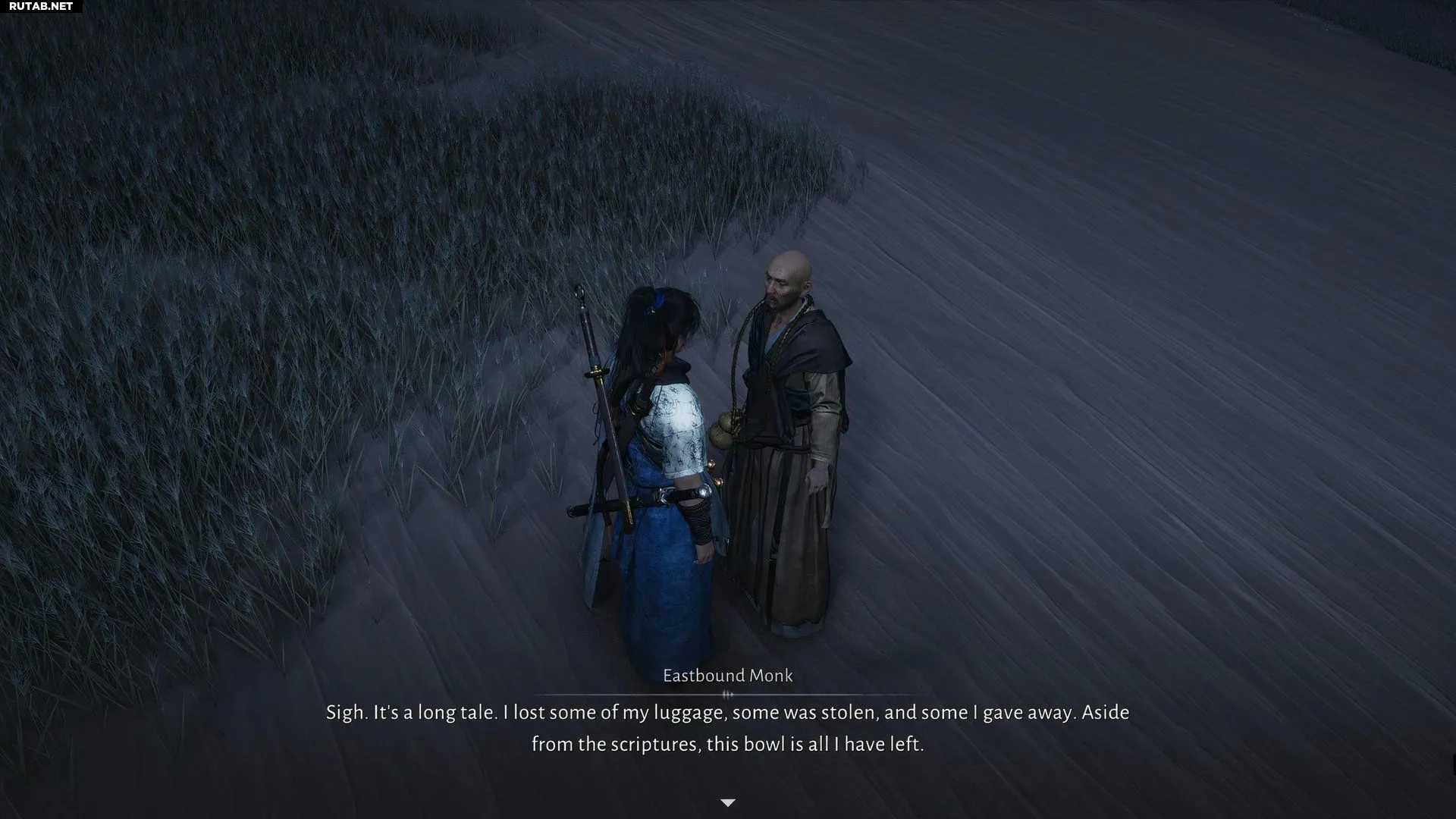 Далее отправляйтесь к югу от Верблюжьей станции, чтобы снова найти монаха. На этот раз он расскажет, что по пути на него напали бандиты и ограбили.