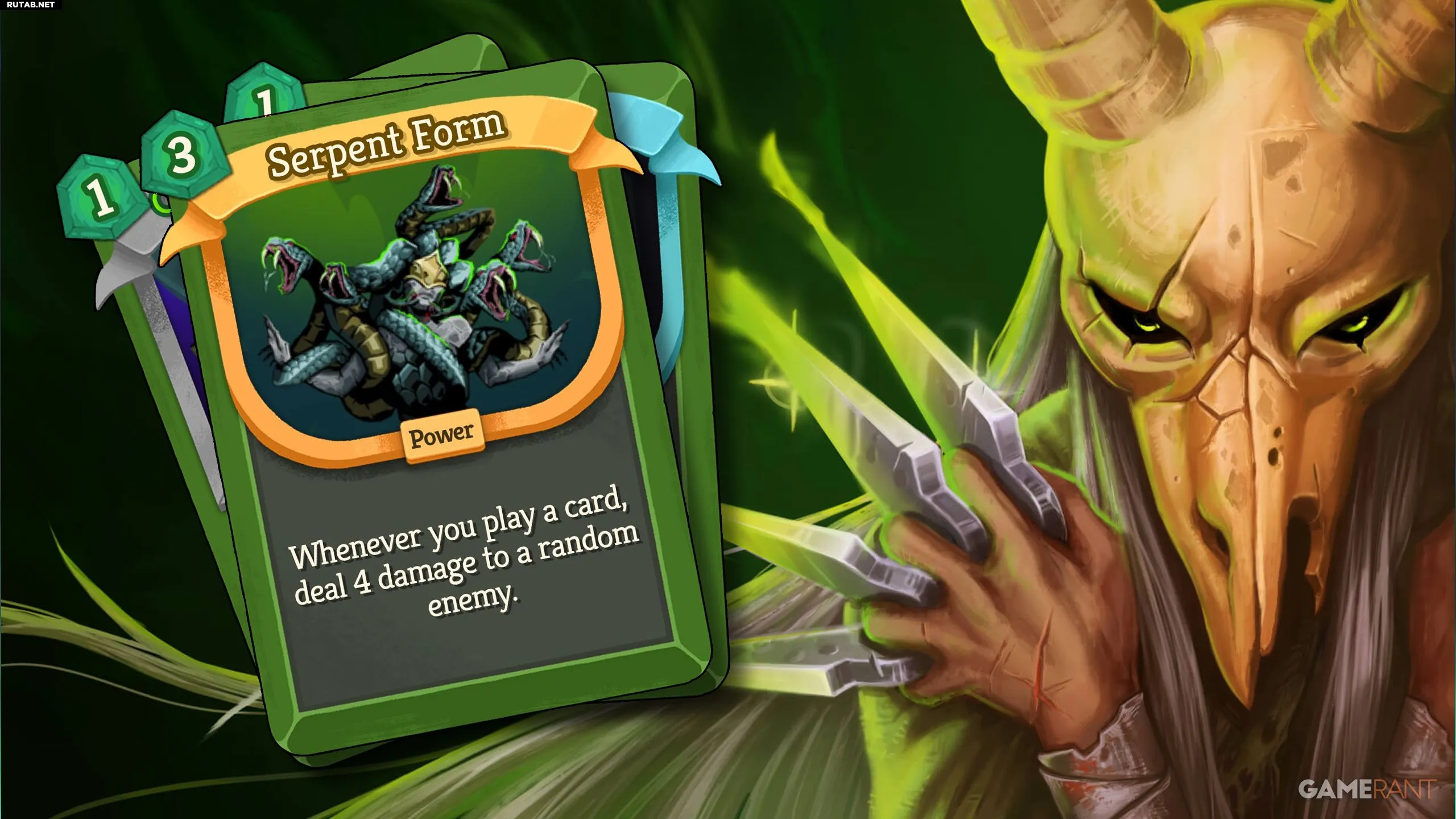 - Змеиная форма (Сила, 3): Каждый раз, когда вы разыгрываете карту, наносит 4 урона случайному врагу.