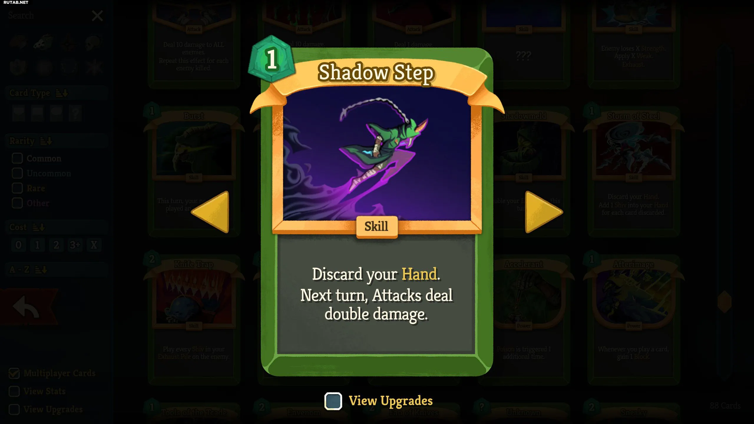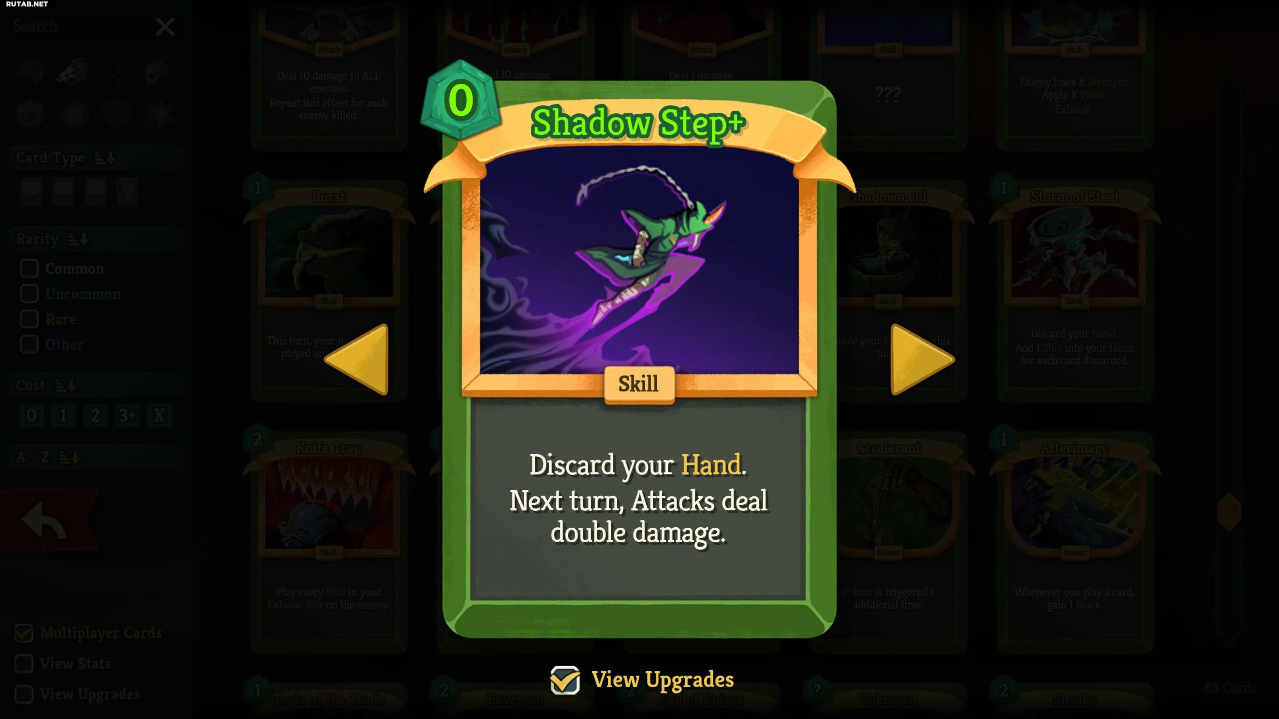 - Шаг тени (Умение, 1): Сбрасывает вашу руку. В следующем ходу атаки наносят двойной урон.