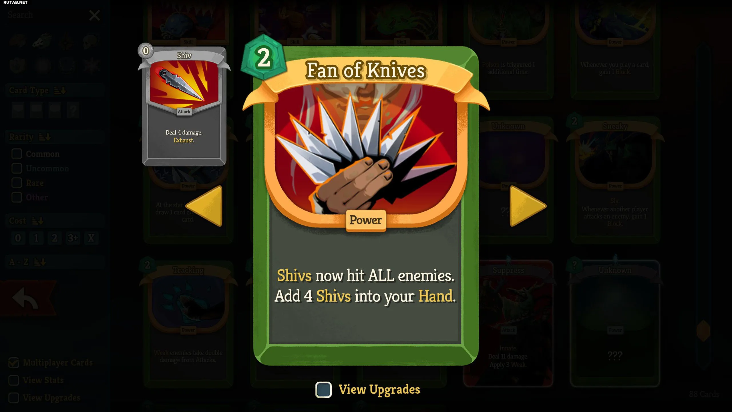 - Веер клинков (Сила, 2): Кинжалы теперь поражают ВСЕХ врагов. Добавляет 4 Кинжала в руку.