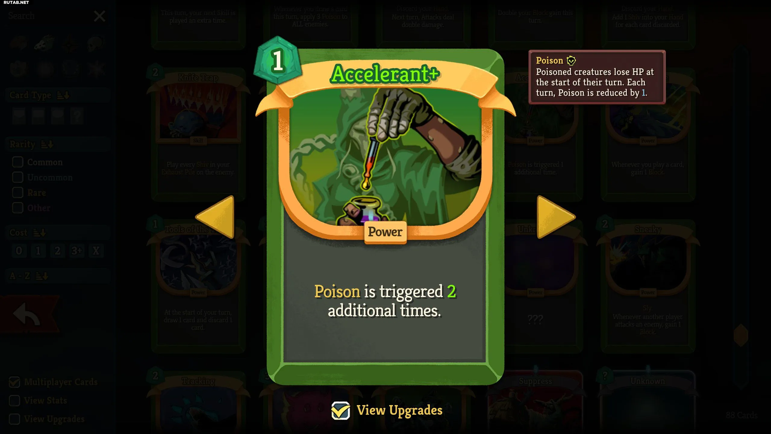 - Вспышка (Сила, 1): Каждый 3-й раз, когда вы накладываете Яд, наносит 11 урона ВСЕМ врагам.