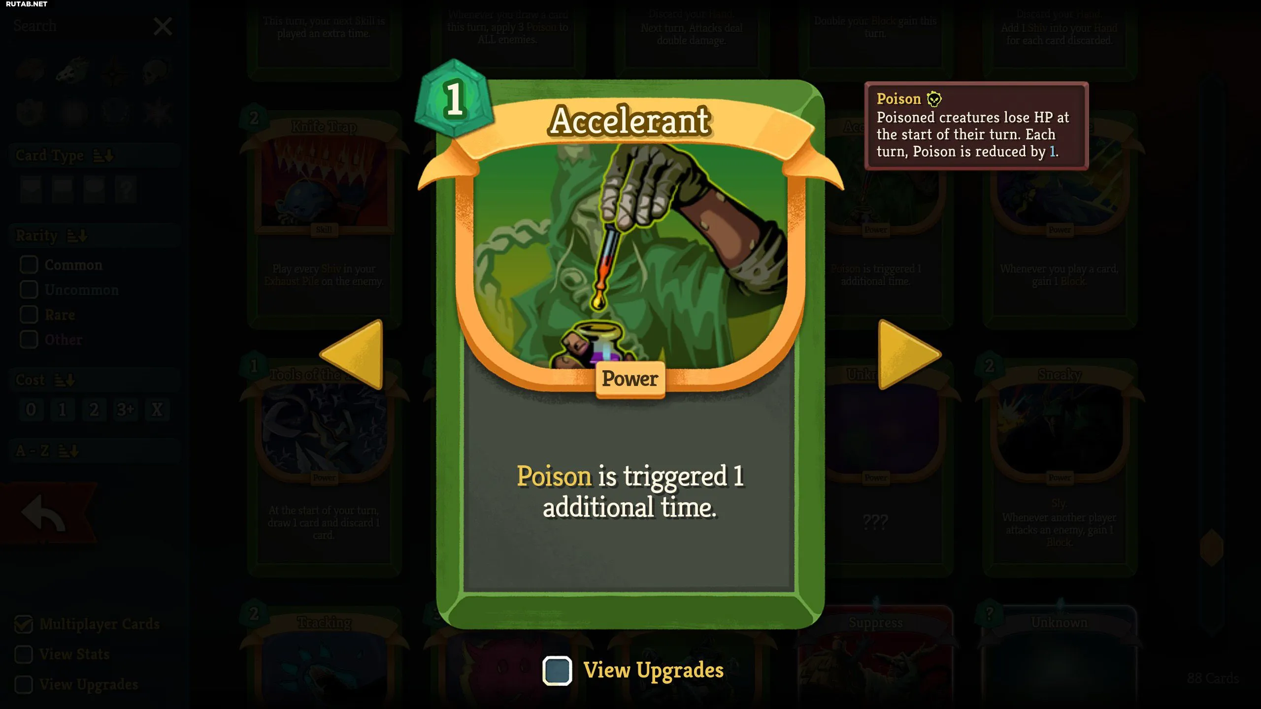 - Разъедающая волна (Умение, 1): Каждый раз, когда вы добираете карту в этом ходу, накладывает 3 Яда на ВСЕХ врагов.