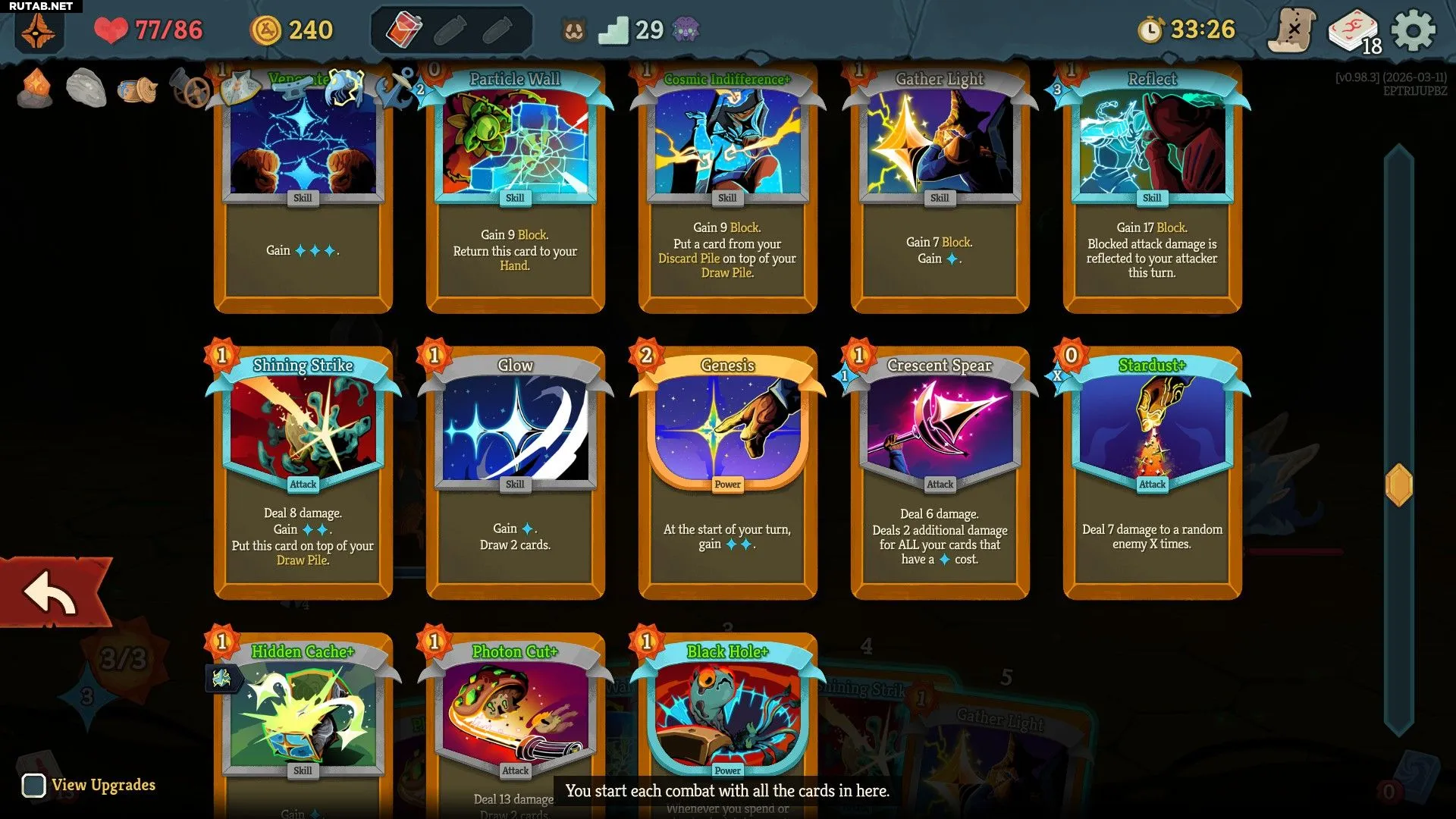 - Glow, Photon Cut и Cosmic Indifference помогут вам искать в колоде карты для блока и генерации Звёзд.