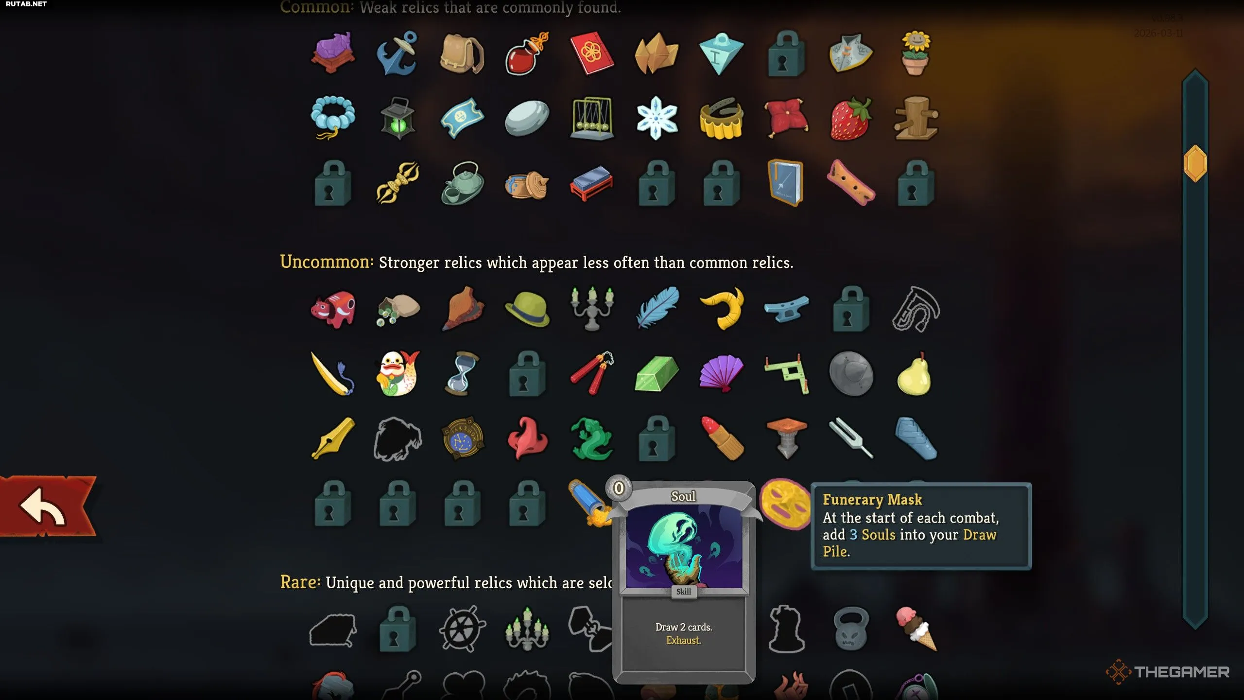 - Funerary Mask (Погребальная Маска) — в начале каждого боя добавляет 3 Души в вашу колоду добора.