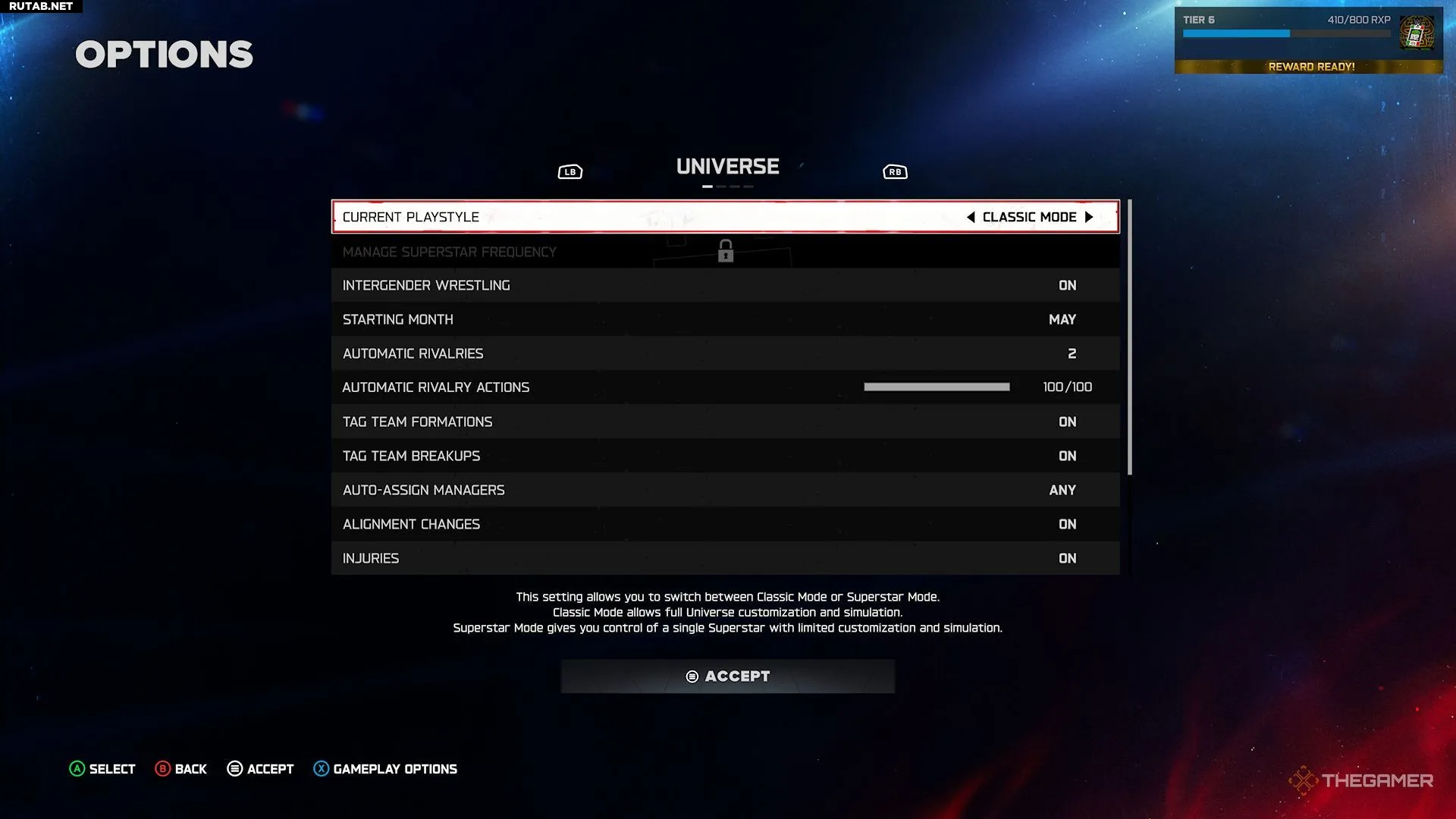 Прежде чем что-либо делать в режиме «Вселенная», сначала нужно выбрать, хотите ли вы играть в режиме «Суперзвезда» или в «Классическом» режиме. В обоих режимах вам предоставляется много контроля над настройкой вашей Вселенной.
