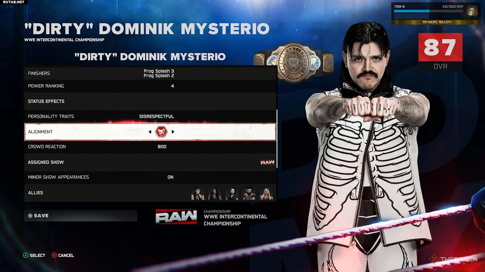 Здесь вы можете изменить такие параметры, как черты личности, амплуа (хил или бэбифейс), реакцию толпы, участие в малых шоу и отношения.