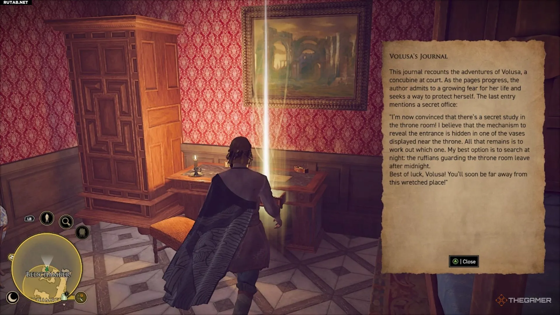 Затем направляйтесь в восточное крыло дворца. В одной из спален, принадлежащей фаворитке, на столе вы найдёте её дневник. Из записей станет ясно, что Волуса боится за свою жизнь и упоминает потайную комнату в кабинете, которую лучше искать после полуночи.