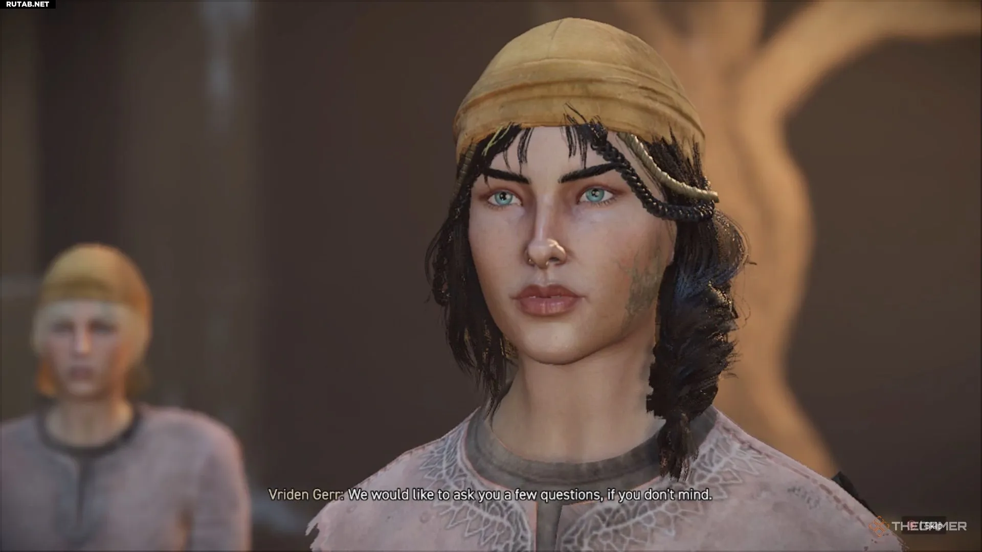 Выйдите из тронного зала и поверните направо. Во внутреннем дворе найдите фаворитку по имени Волуса. Поговорите с ней, но полезной информации вы не получите.