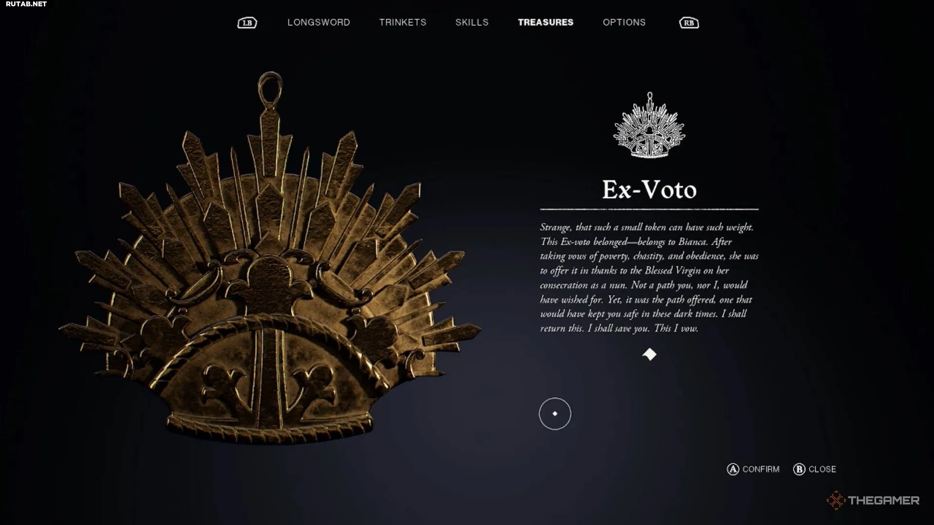 В игре 1348 Ex Voto сокровища можно найти, продвигаясь по городам, опустошённым чумой, чтобы спасти свою подругу детства Бьянку. Каждое найденное сокровище пополняет подарок для Бьянки, но некоторые из этих маленьких даров легко упустить из виду.