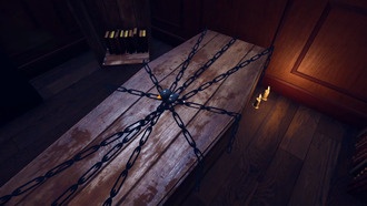 Наверху пройдите через дверь справа, чтобы попасть в Кладовая — Восток. При входе вы услышите голос, и дверь вскоре закроется. Когда это произойдет, достаньте Camera Obscura, наденьте фильтр «Экспозиция» и сфотографируйте призрака Девочка, ищущая помощи в углу. Подберите появившийся на полу Багровый дневник 5, чтобы продолжить.