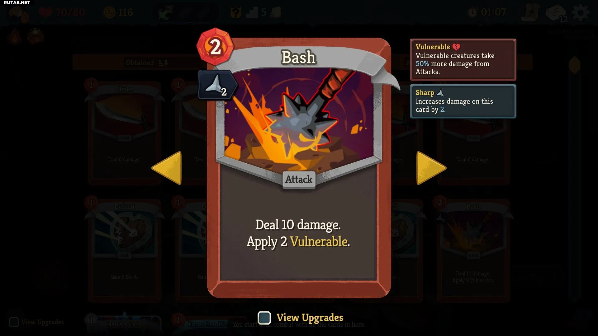На любую карту можно наложить только одно заклинание, но оно должно быть с ней совместимо. Эффекты этих улучшений довольно просты, и игра точно расскажет, что они делают, если навести на них курсор (на улучшенную карту, реликвию или опцию с тегом чар).