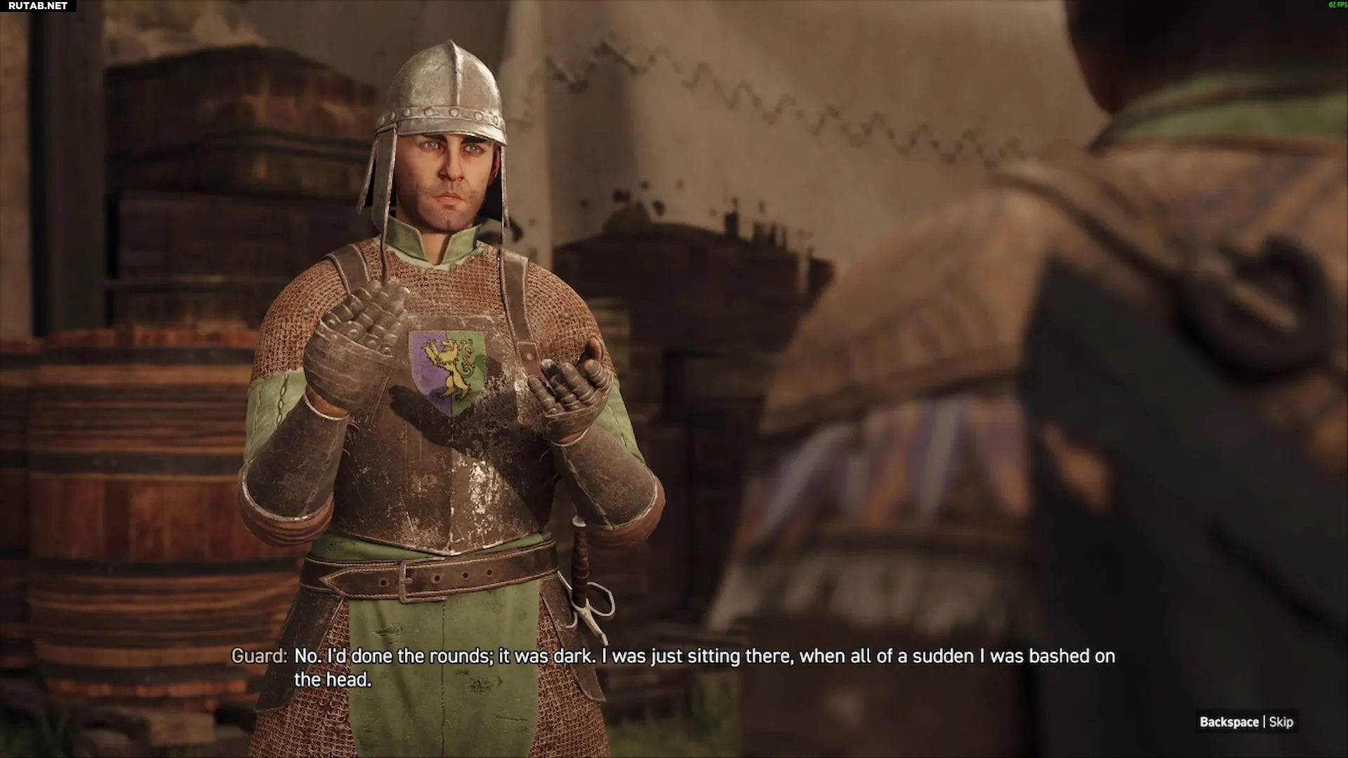 Поговорите со стражником у входа в кладовую рядом с покоями капитана, чтобы расспросить его о ночи ограбления. Он скажет, что почти ничего не помнит о той ночи, но если вы пройдете проверку навыка Дипломатия, он признается, что его запугали и подкупили трое крупных, коренастых людей в масках, чтобы он смотрел в другую сторону.Затем войдите внутрь кладовой и активируйте режим выслеживания, чтобы найти следующие улики.