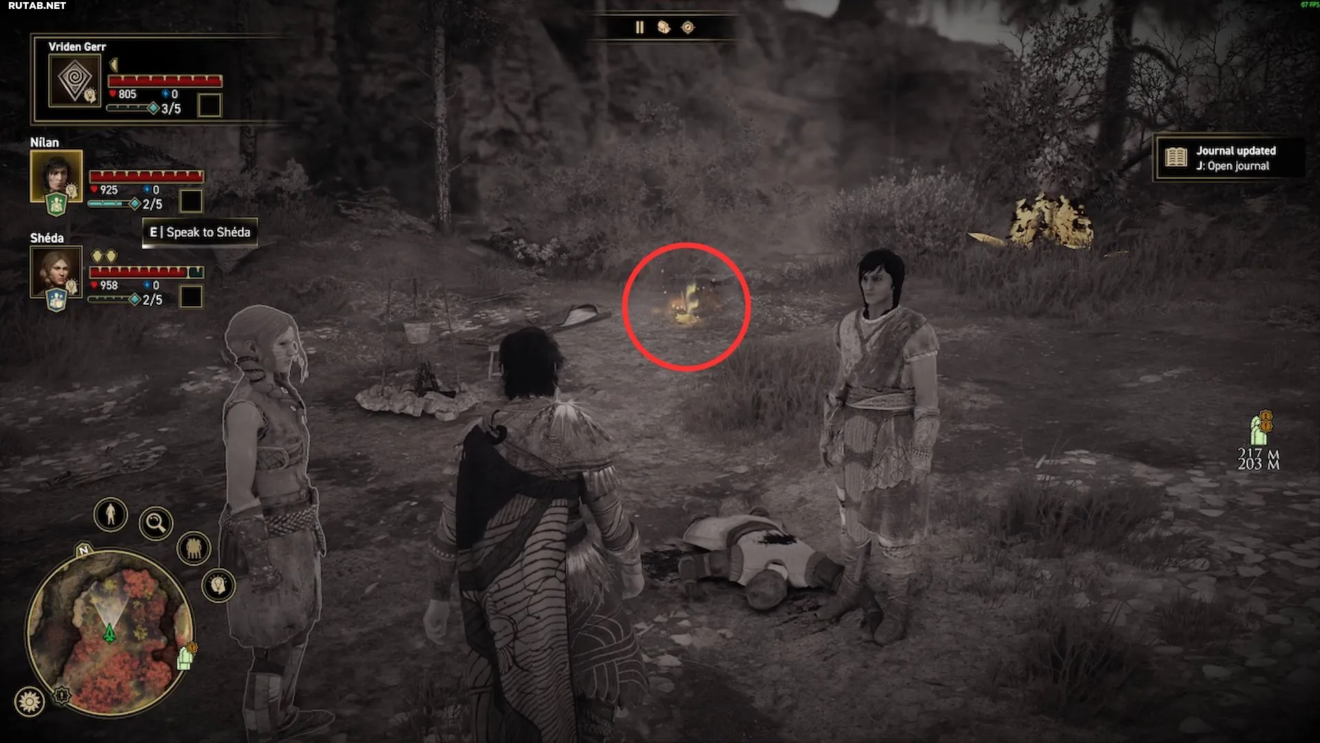 Активируйте режим выслеживания и найдите место раскопок рядом с телом, возле спального мешка. Используйте лопату, чтобы раскопать земляной холмик, и поднимите «Дневник, покрытый землёй». Из него вы узнаете, что погибший исследовал гробницу человека по имени Матеус, и статуэтка, вероятно, связана с ним. Лопату можно найти возле дома Минана в Вигешваре.