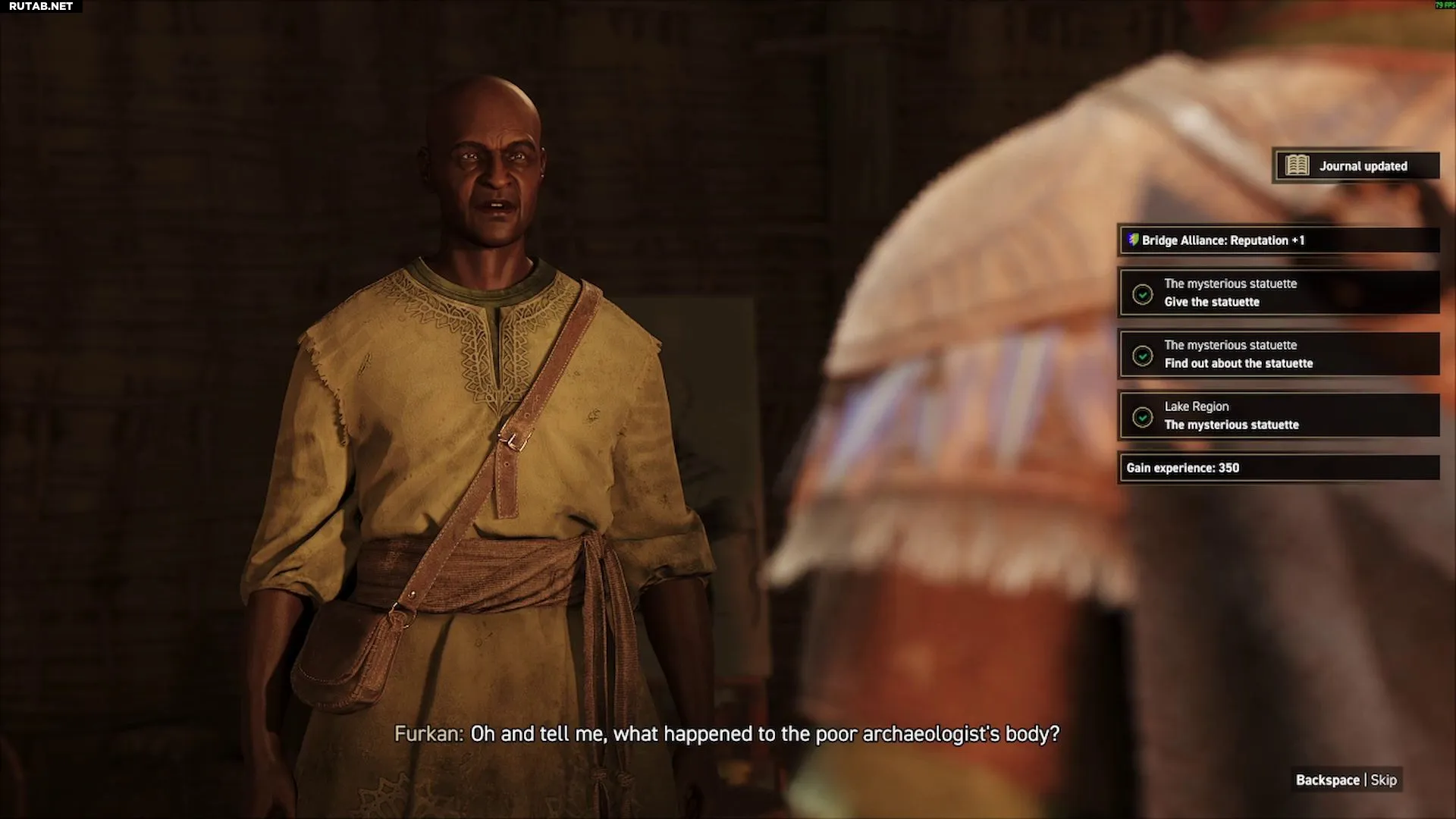 - Фуркан: Показав ему статуэтку и дневник, вы узнаете, что погибший, скорее всего, был археологом или учёным из Телемы. Матеус, упомянутый в книге, — известная историческая фигура, который, по слухам, отплыл к далёким берегам. Фуркан предположит, что статуэтку мог вырезать сам Матеус, оказавшись на этом острове.