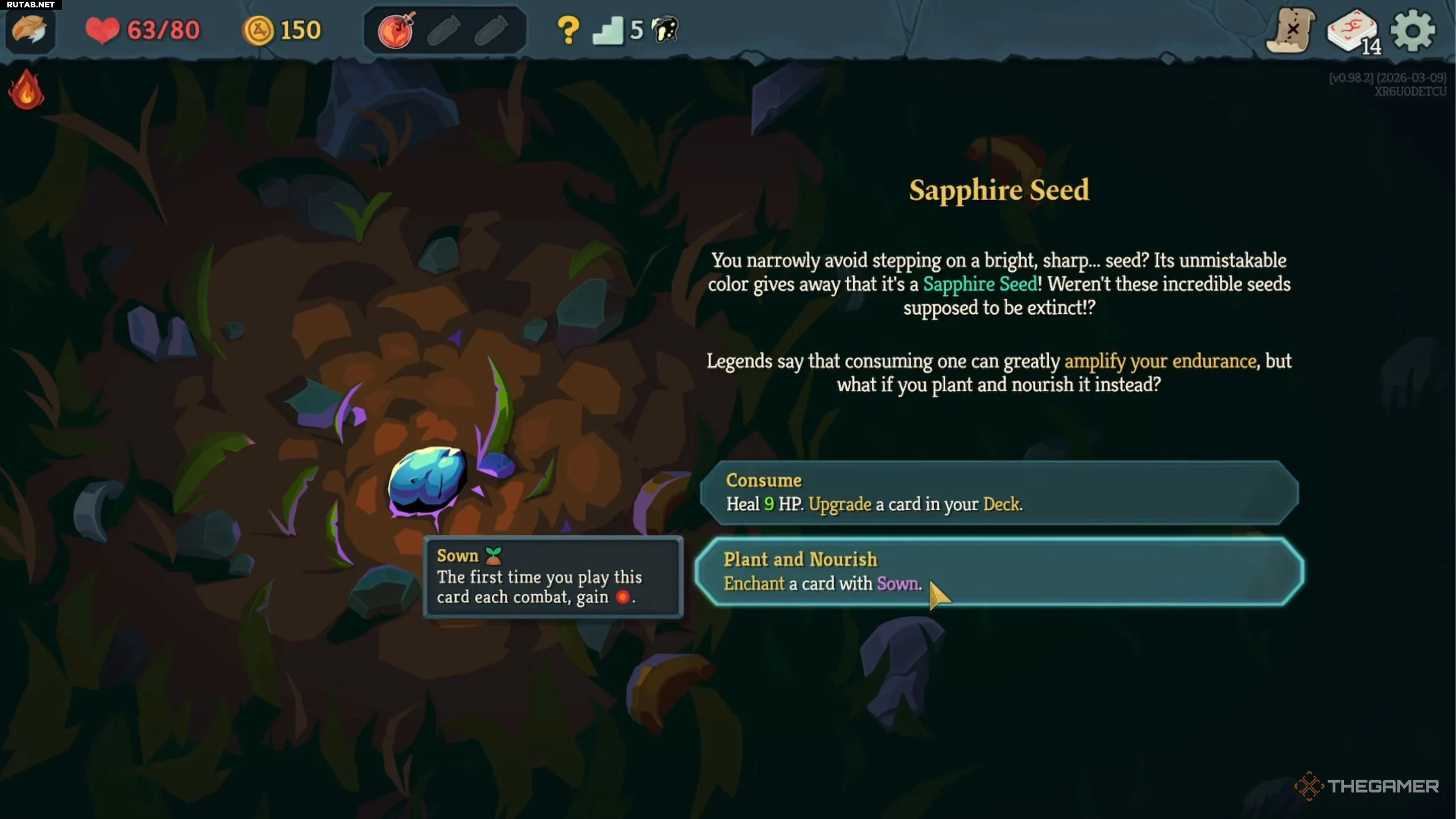 Лучший выбор: Эффект «Посеянное» даёт дополнительную энергию при первом розыгрыше зачарованной карты в бою, что может быть полезно для определённых сборок. Однако лечение и улучшение карты — обычно более безопасный и полезный выбор.