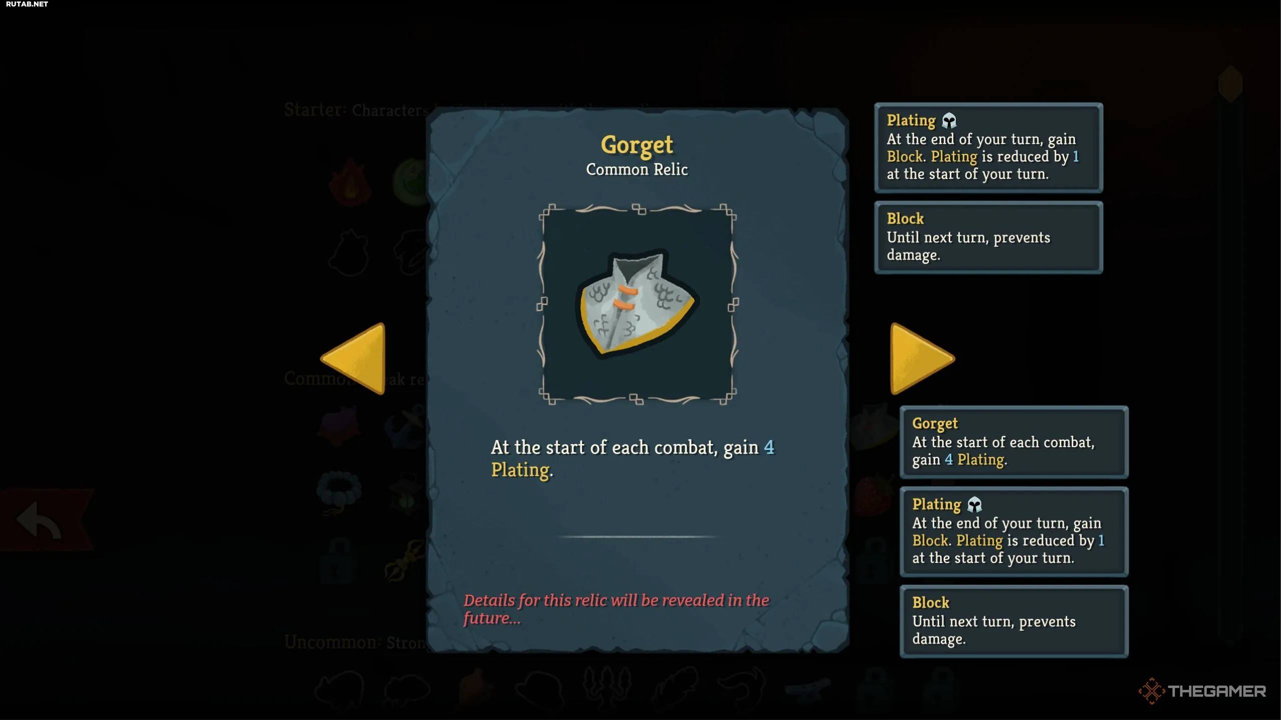- Горжет (Обычная): Возможность получать блок в течение четырёх ходов в начале каждого боя — огромное преимущество. Это может предотвратить получение урона в большинстве стандартных схваток.