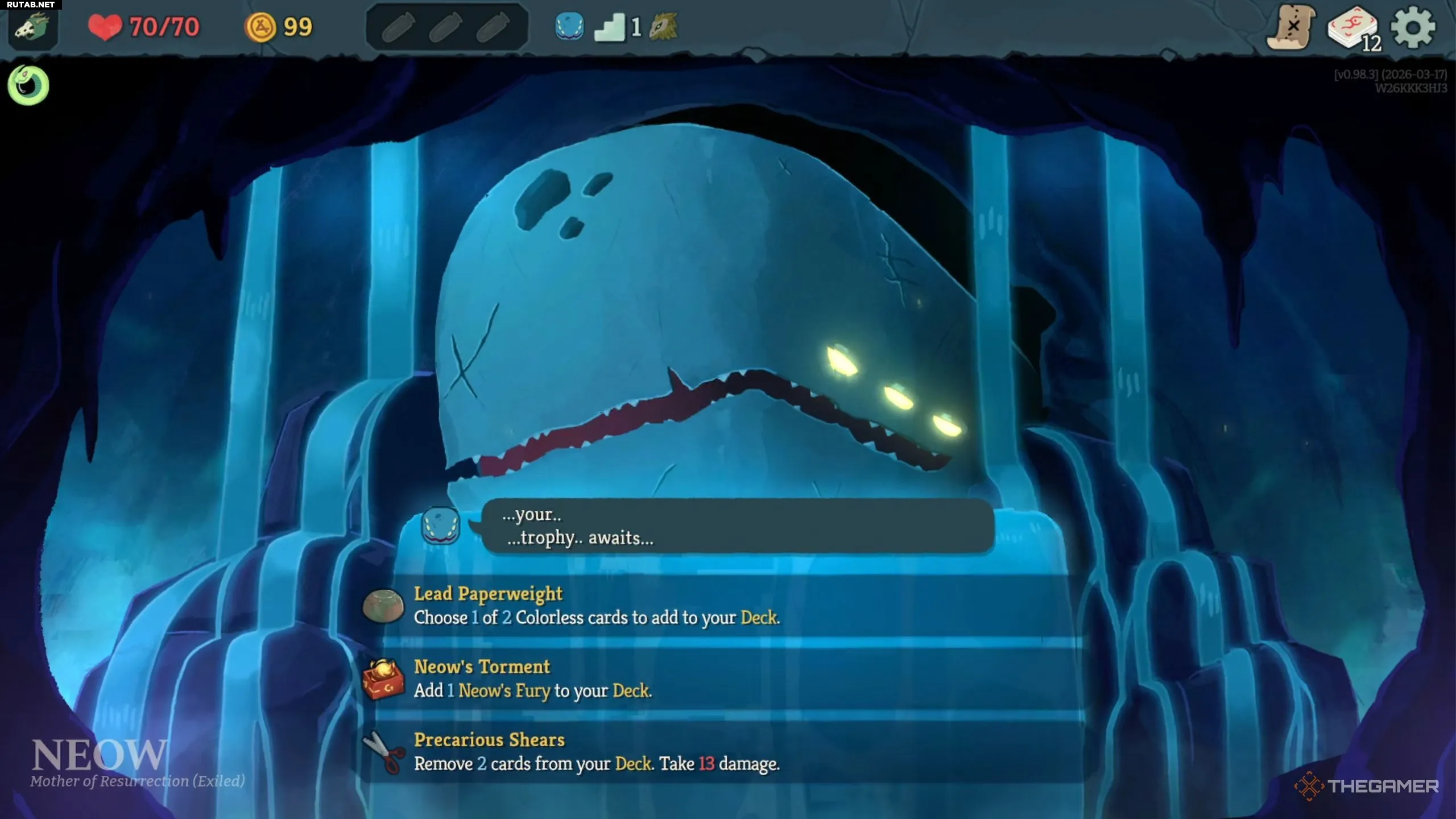 - Устрашающий шлем (Редкая): Хотя некоторые сборки заставляют вас часто разыгрывать карты стоимостью более двух единиц энергии, это не то, что происходит с каждой сборкой, что делает эту реликвию очень ситуативной.