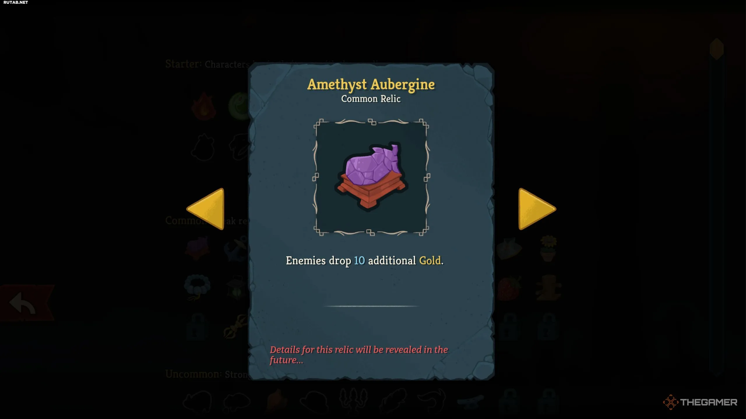 - Аметистовый баклажан (Обычная): Десять золотых, которые вы получаете от врагов, могут быть полезны, если на вашем пути к концу акта есть торговец.