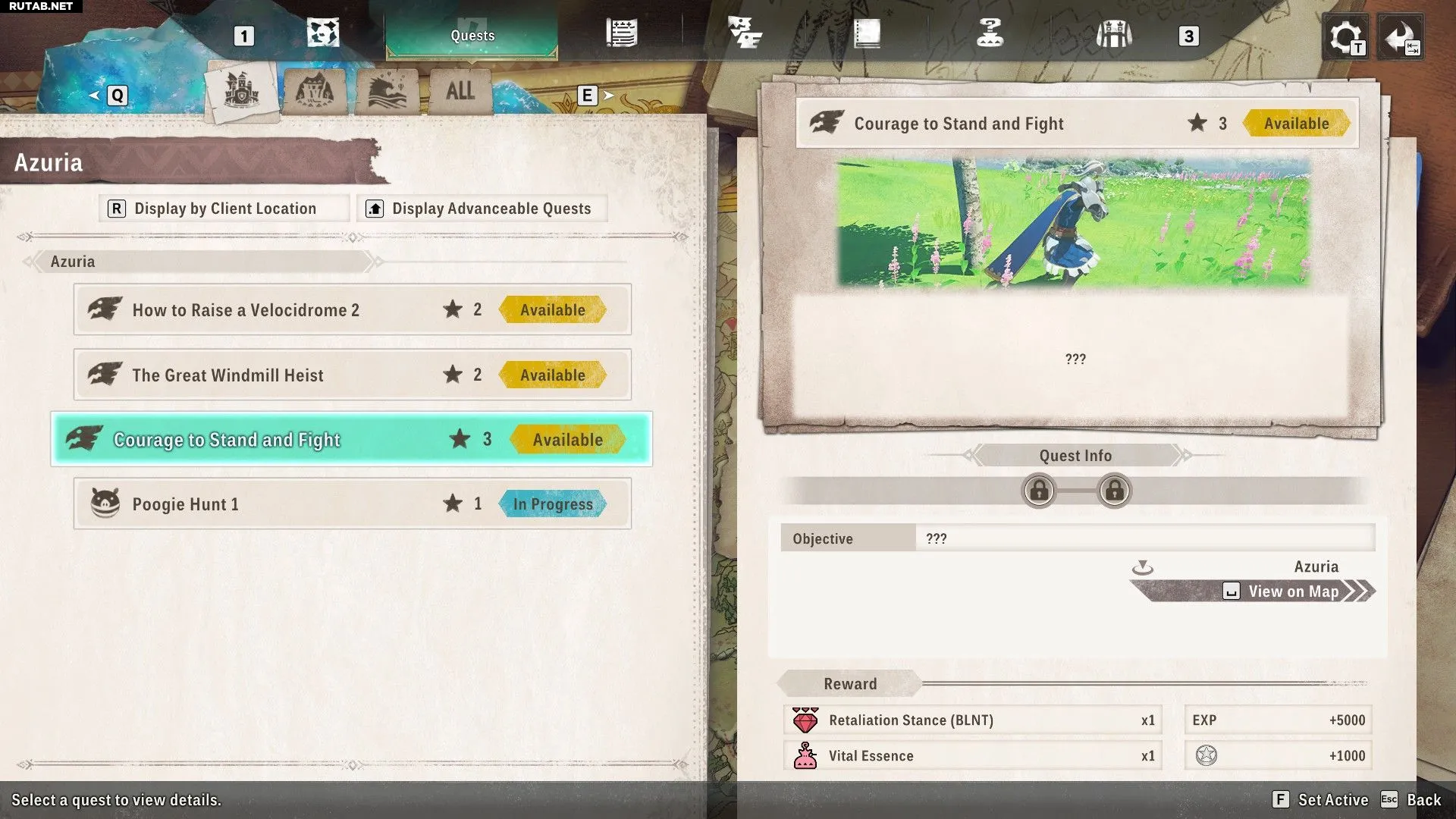 Все доступные побочные задания (даже ещё не начатые) можно посмотреть во вкладке «Задания» в меню паузы. Там же отображаются награды. Учтите, что не все квесты в регионе доступны сразу — для открытия некоторых нужно продвижение по сюжету.