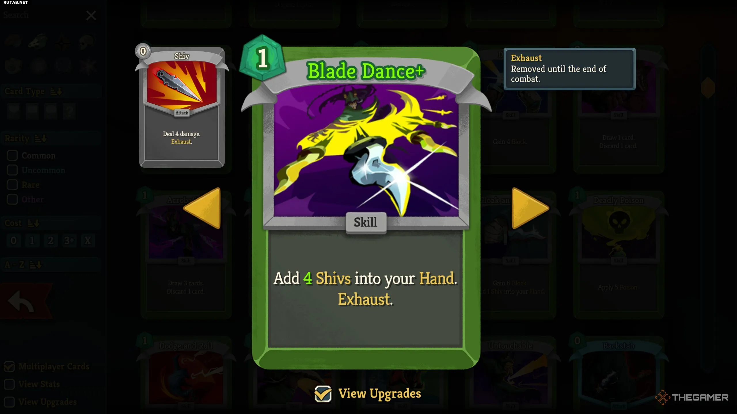 - Танец Клинков (1 энергия): Добавляет три или четыре Кинжала в руку (четыре, если улучшена).