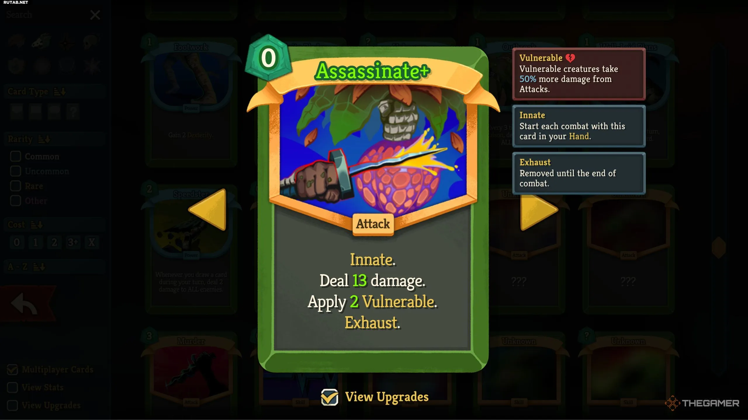 - Убийство (0 энергии): Эта карта начинает бой в вашей руке. Она наносит урон и накладывает Уязвимость на врагов.
