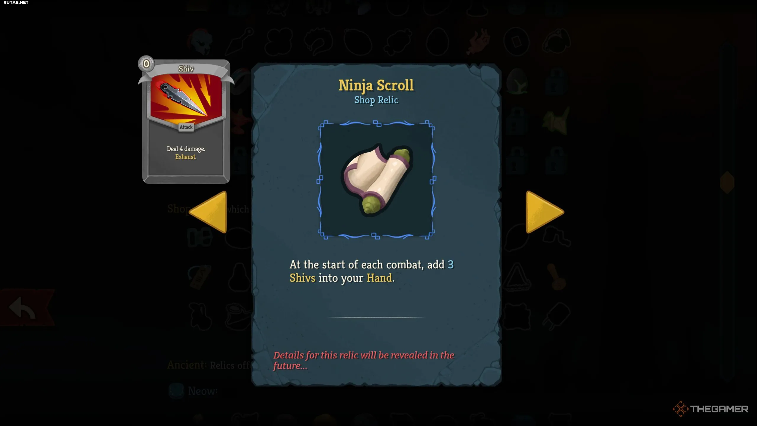 - Декоративный Веер: так как карта Кинжал считается атакой, эта реликвия даёт Защиту при розыгрыше трёх атак за ход, помогая выживать.