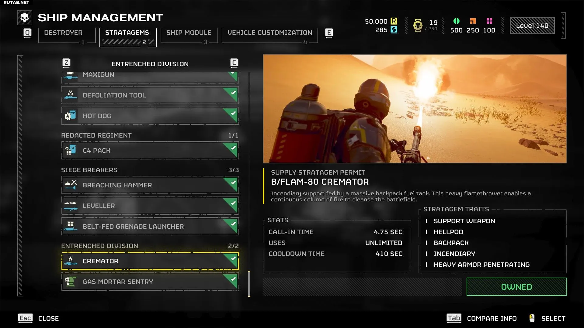 - Cremator имеет 500 единиц топлива в ранце против 750 у огнемёта (разделённых на 5 канистр).