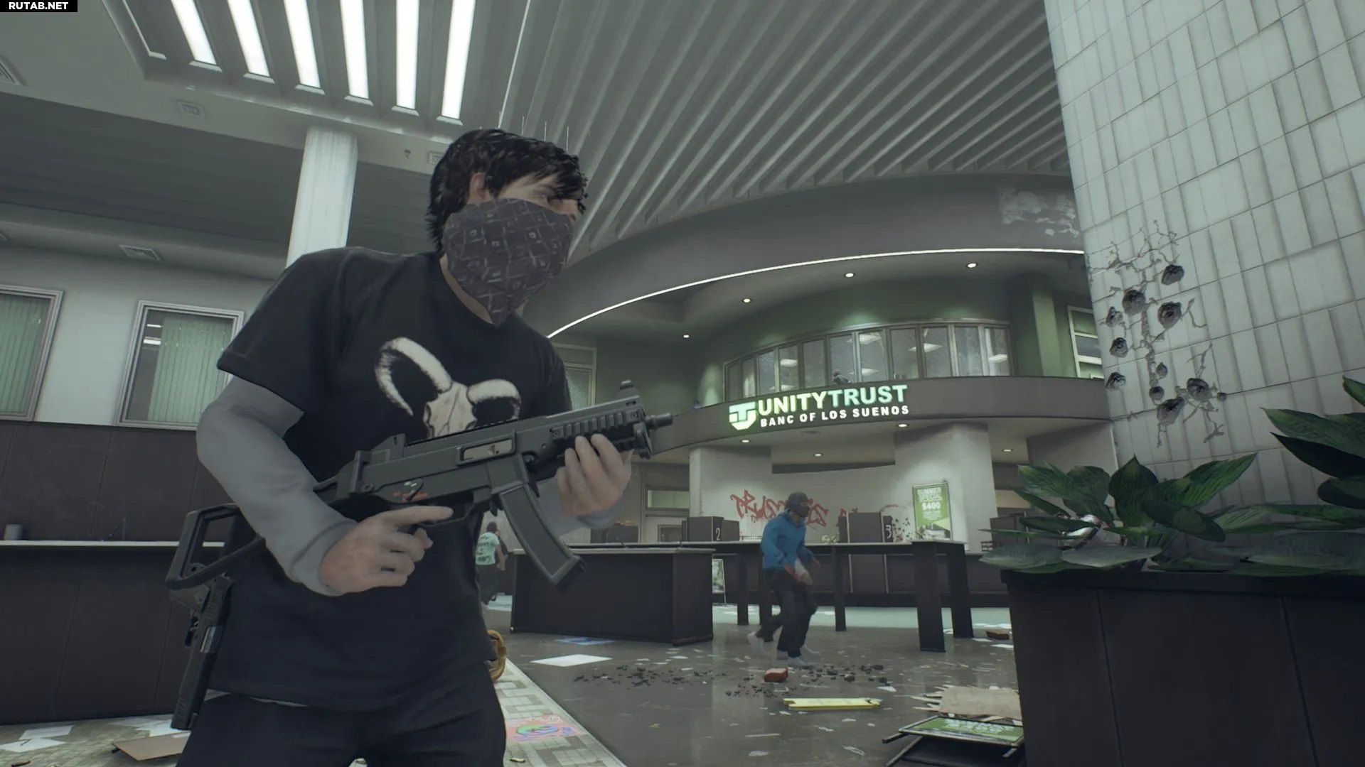 Миссия ориентирована на ближний бой, но главный зал банка часто провоцирует перестрелки на средней дистанции. Газовые гранаты (желательно из подствольника) эффективны против бунтовщиков в зоне операционистов, а компактное оружие вроде пистолетов-пулемётов поможет сохранить мобильность в офисах.