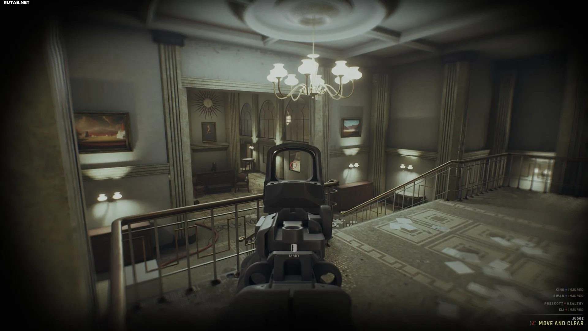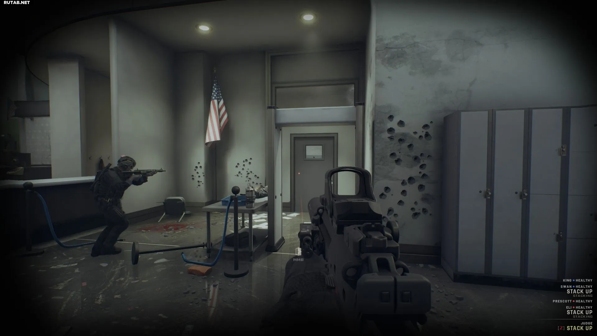 Начните со стоянки, построившись у задней двери. Прикажите команде проломить дверь с применением светошумовых или газовых гранат, затем зачистите всё лобби. Проверьте коридор к туалетам слева и балкон на втором этаже — там могут быть снайперы.