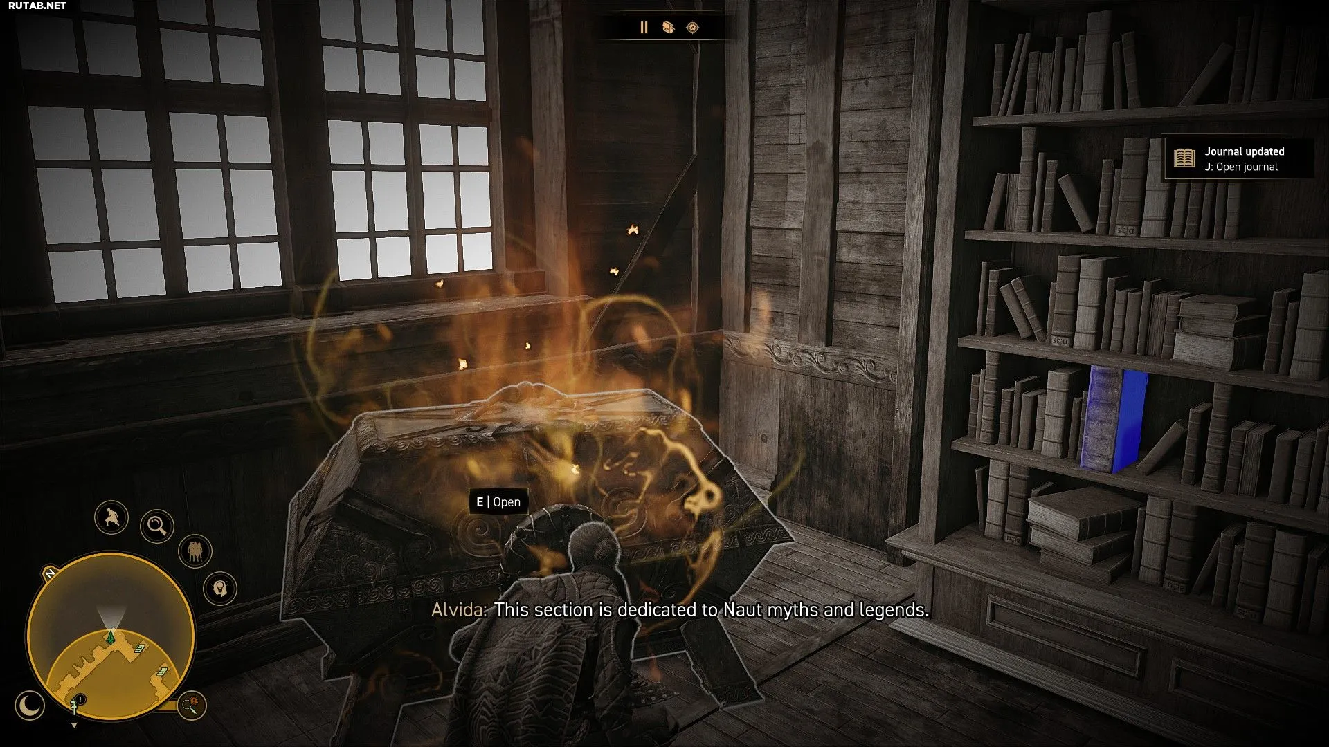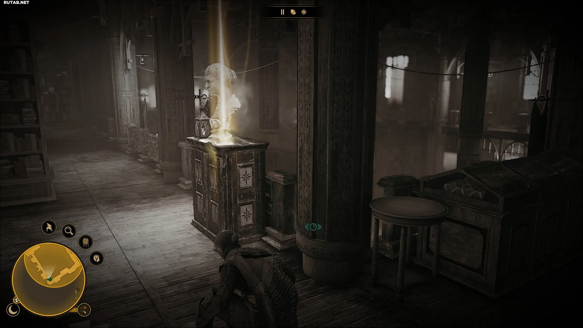 После этого поднимитесь наверх, чтобы найти потайную комнату. Сначала взаимодействуйте с бюстом в левой части комнаты. Там вы найдёте ключ. Затем идите в левый верхний угол и взаимодействуйте с книжным шкафом. Книга, найденная ранее, подскажет вам решение и активирует рычаг, открывающий потайную комнату в библиотеке.