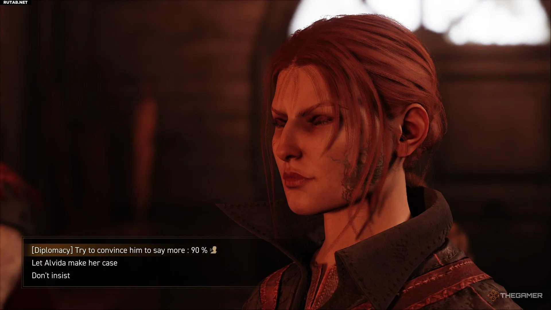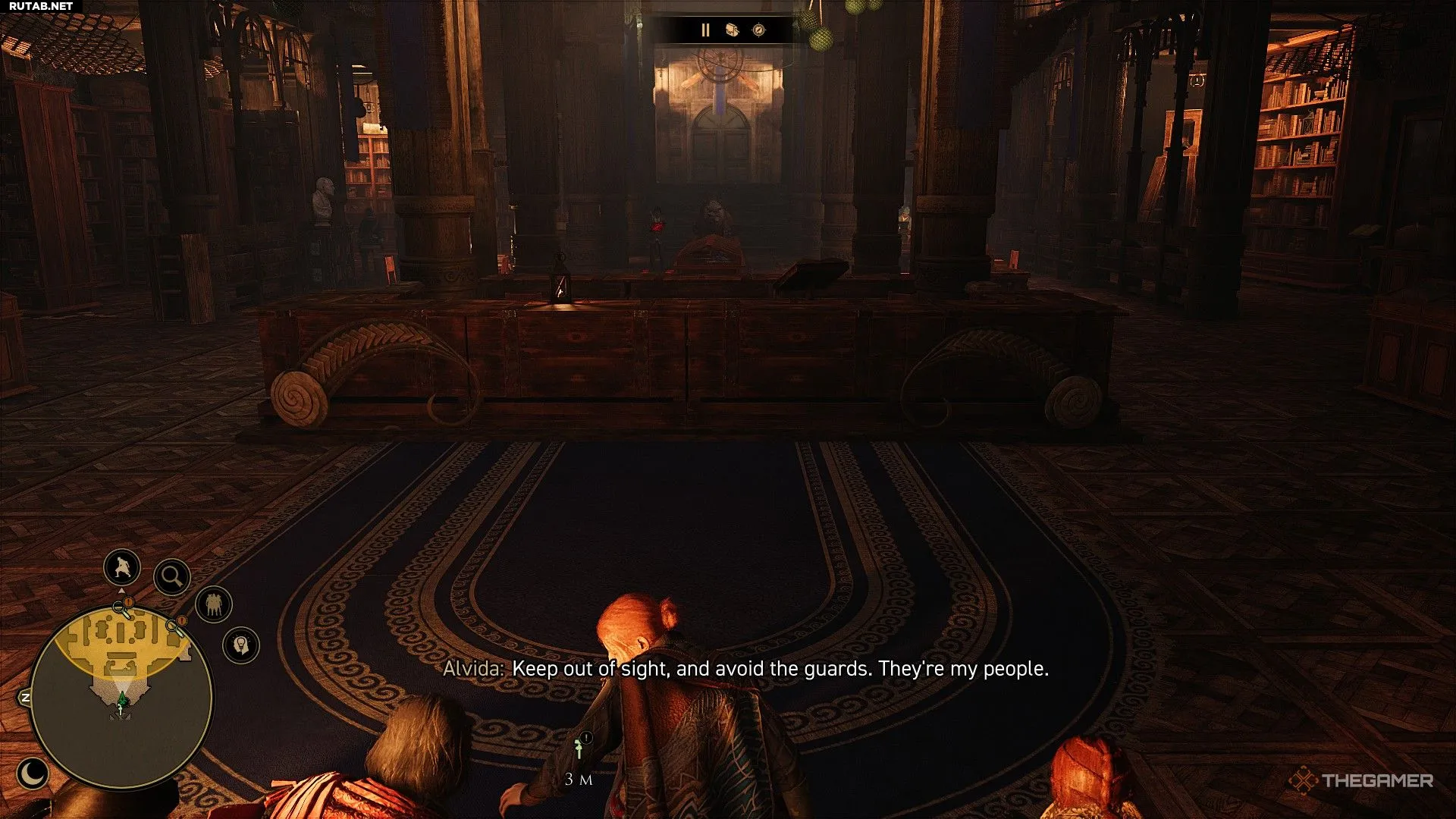 В диалоге у вас будет несколько реплик, чтобы попытаться выудить у него информацию. Что бы вы ни говорили, он не даст вам доступа в библиотеку, где хранятся контракты. Однако если вы позволите Альвиде говорить, когда появится выбор, или пройдёте проверку Дипломатии, он расскажет вам о потайной комнате в библиотеке. Это пригодится позже.
