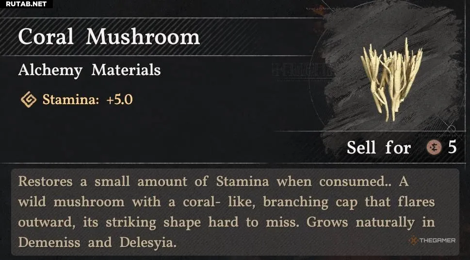 Изначально я получил этот коралловый гриб из разрушенного ящика на развалинах торгового поста к югу от холма Энвил в Хернанде. Однако в подсказке указано, что он растёт в Демениссе и Делезии.